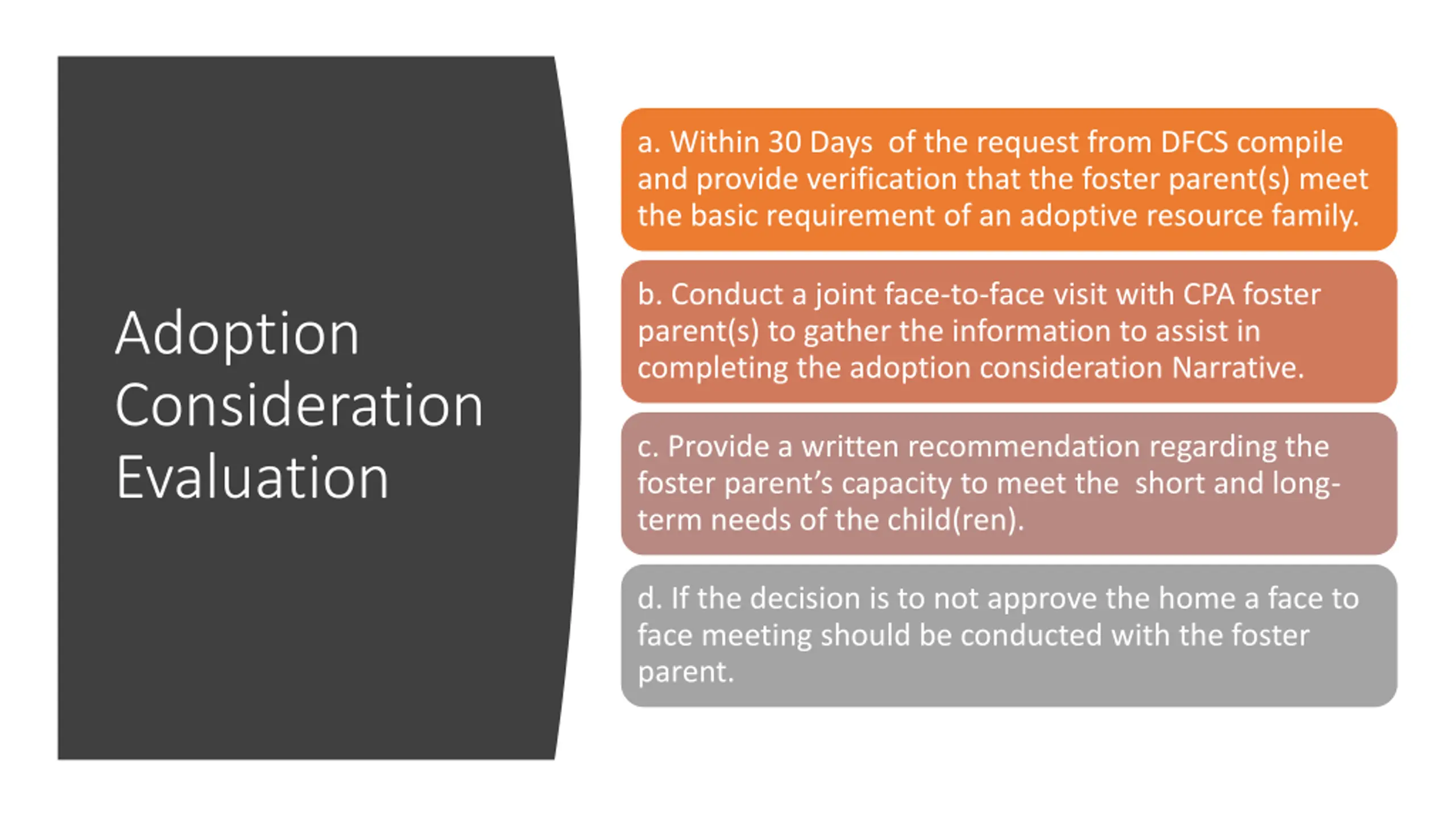 a. Within 30 Days of the request from DFCS compile and provide verification that the foster parent(s) meet the basic requirement of an adoptive resource family. b. Conduct a joint face-to-face visit with CPA foster parent(s) to gather the information to assist in completing the adoption consideration Narrative. Adoption Consideration Evaluation c. Provide a written recommendation regarding the foster parent s capacity to meet the short and long- term needs of the child(ren). d. If the decision is to not approve the home a face to face meeting should be conducted with the foster parent.