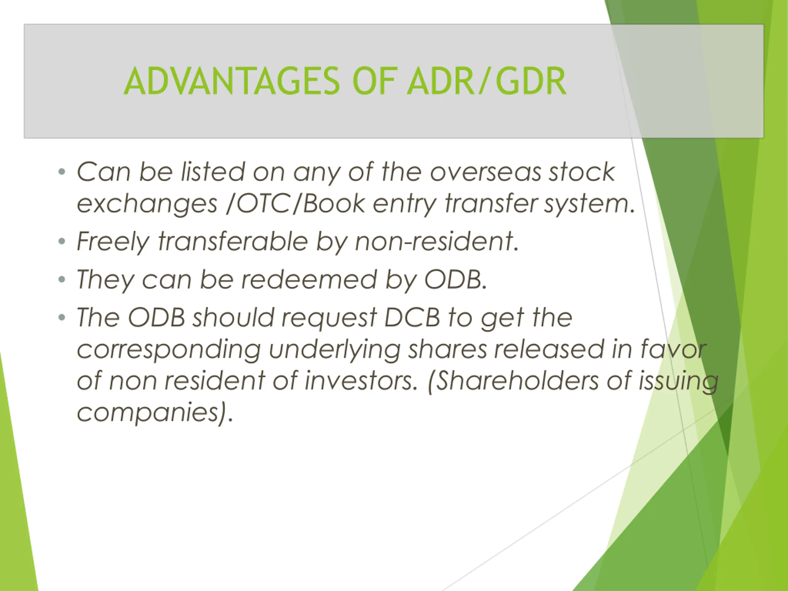 ADVANTAGES OF ADR/GDR Can be listed on any of the overseas stock exchanges /OTC/Book entry transfer system. Freely transferable by non-resident. They can be redeemed by ODB. The ODB should request DCB to get the corresponding underlying shares released in favor of non resident of investors. (Shareholders of issuing companies).