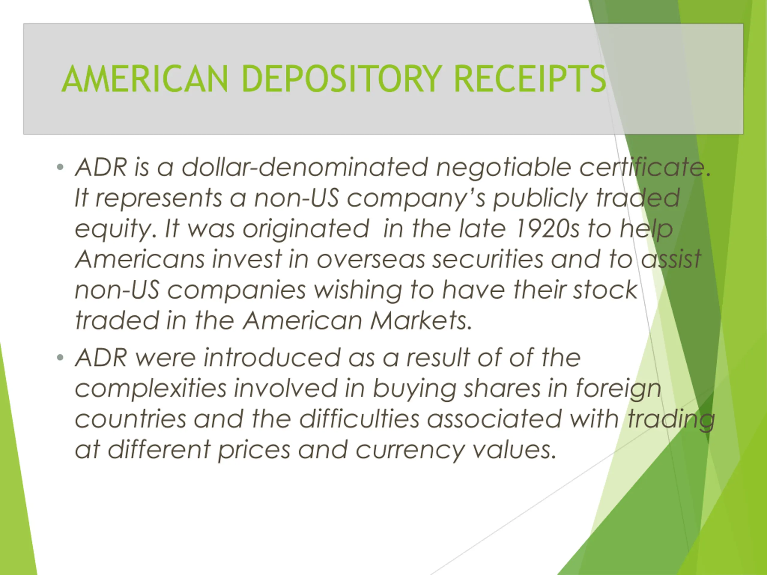 AMERICAN DEPOSITORY RECEIPTS ADR is a dollar-denominated negotiable certificate. It represents a non-US company s publicly traded equity. It was originated in the late 1920s to help Americans invest in overseas securities and to assist non-US companies wishing to have their stock traded in the American Markets. ADR were introduced as a result of of the complexities involved in buying shares in foreign countries and the difficulties associated with trading at different prices and currency values.