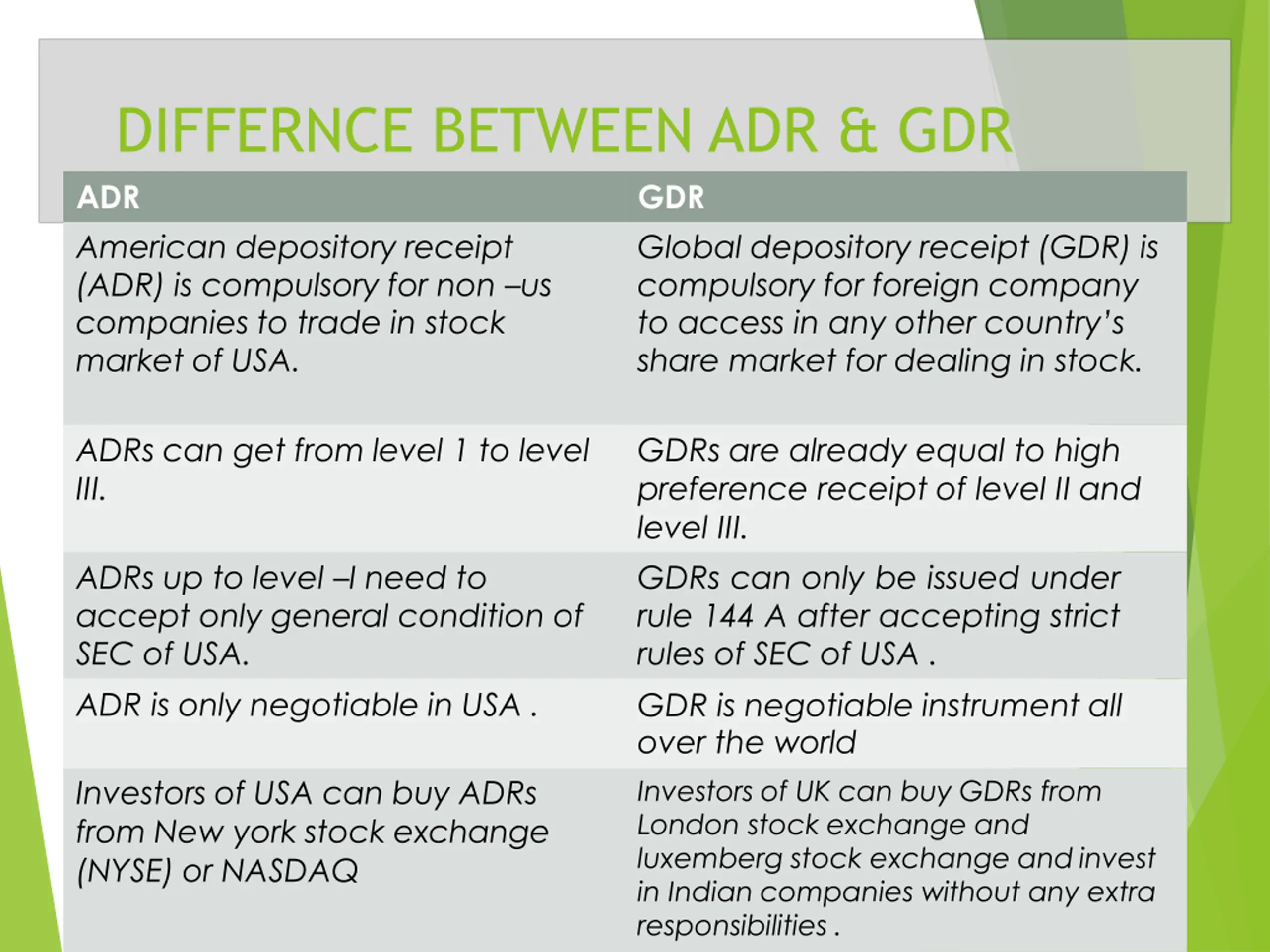DIFFERNCE BETWEEN ADR & GDR ADR American depository receipt (ADR) is compulsory for non us companies to trade in stock market of USA. GDR Global depository receipt (GDR) is compulsory for foreign company to access in any other country s share market for dealing in stock. ADRs can get from level 1 to level III. GDRs are already equal to high preference receipt of level II and level III. GDRs can only be issued under rule 144 A after accepting strict rules of SEC of USA . GDR is negotiable instrument all over the world Investors of UK can buy GDRs from London stock exchange and luxemberg stock exchange and invest in Indian companies without any extra responsibilities . ADRs up to level I need to accept only general condition of SEC of USA. ADR is only negotiable in USA . Investors of USA can buy ADRs from New york stock exchange (NYSE) or NASDAQ
