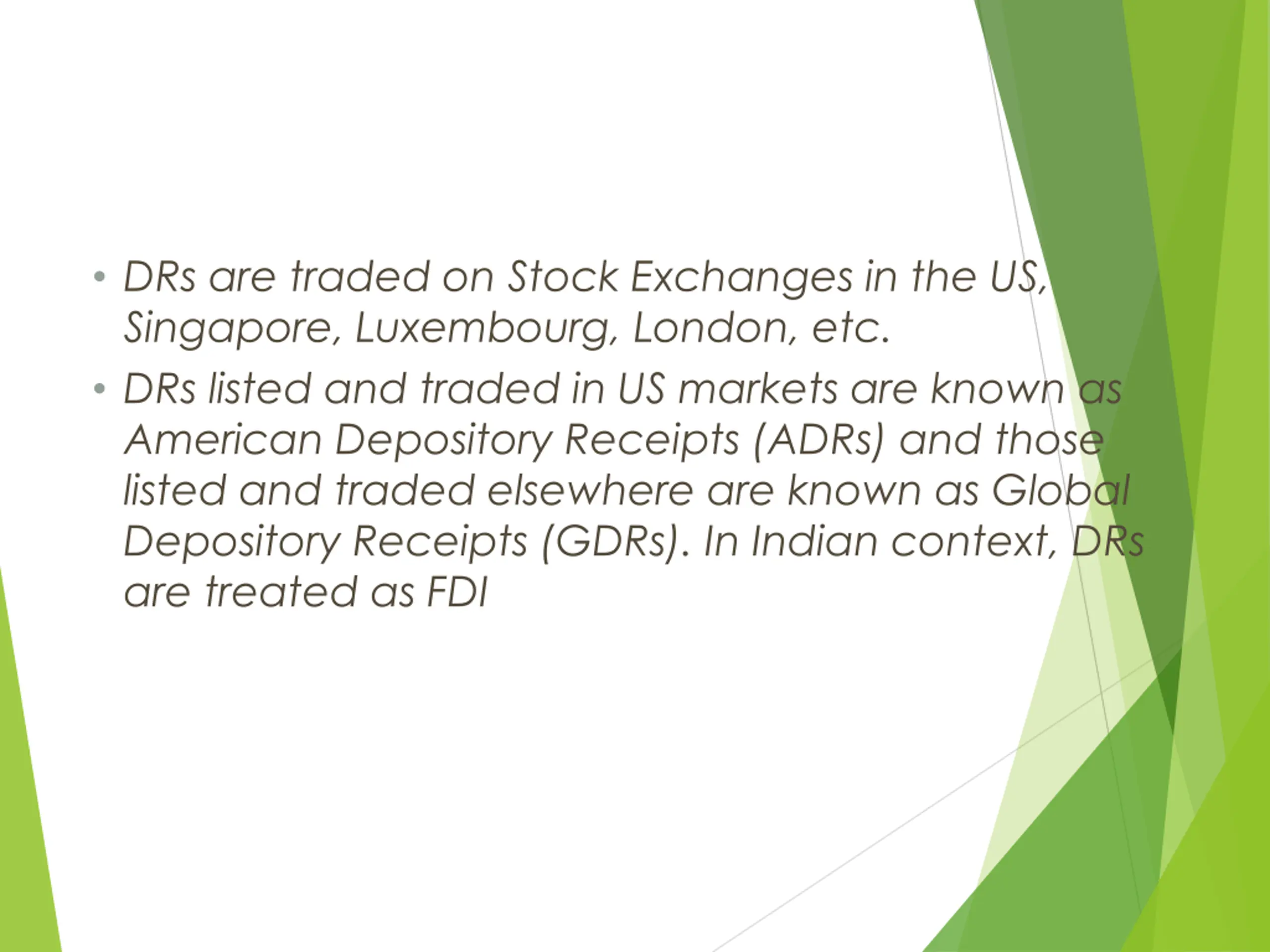 DRs are traded on Stock Exchanges in the US, Singapore, Luxembourg, London, etc. DRs listed and traded in US markets are known as American Depository Receipts (ADRs) and those listed and traded elsewhere are known as Global Depository Receipts (GDRs). In Indian context, DRs are treated as FDI