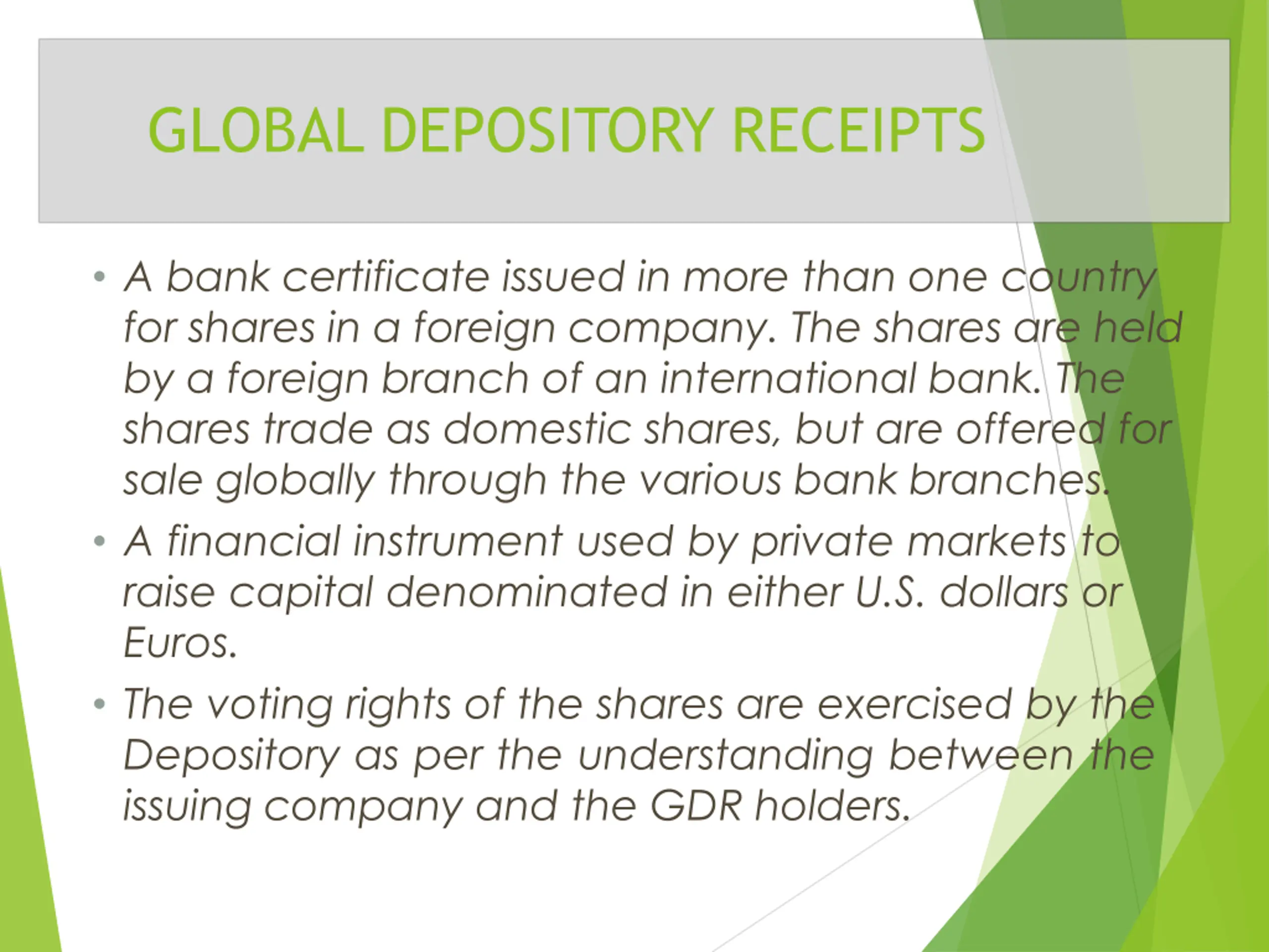 GLOBAL DEPOSITORY RECEIPTS A bank certificate issued in more than one country for shares in a foreign company. The shares are held by a foreign branch of an international bank. The shares trade as domestic shares, but are offered for sale globally through the various bank branches. A financial instrument used by private markets to raise capital denominated in either U.S. dollars or Euros. The voting rights of the shares are exercised by the Depository as per the understanding between the issuing company and the GDR holders.