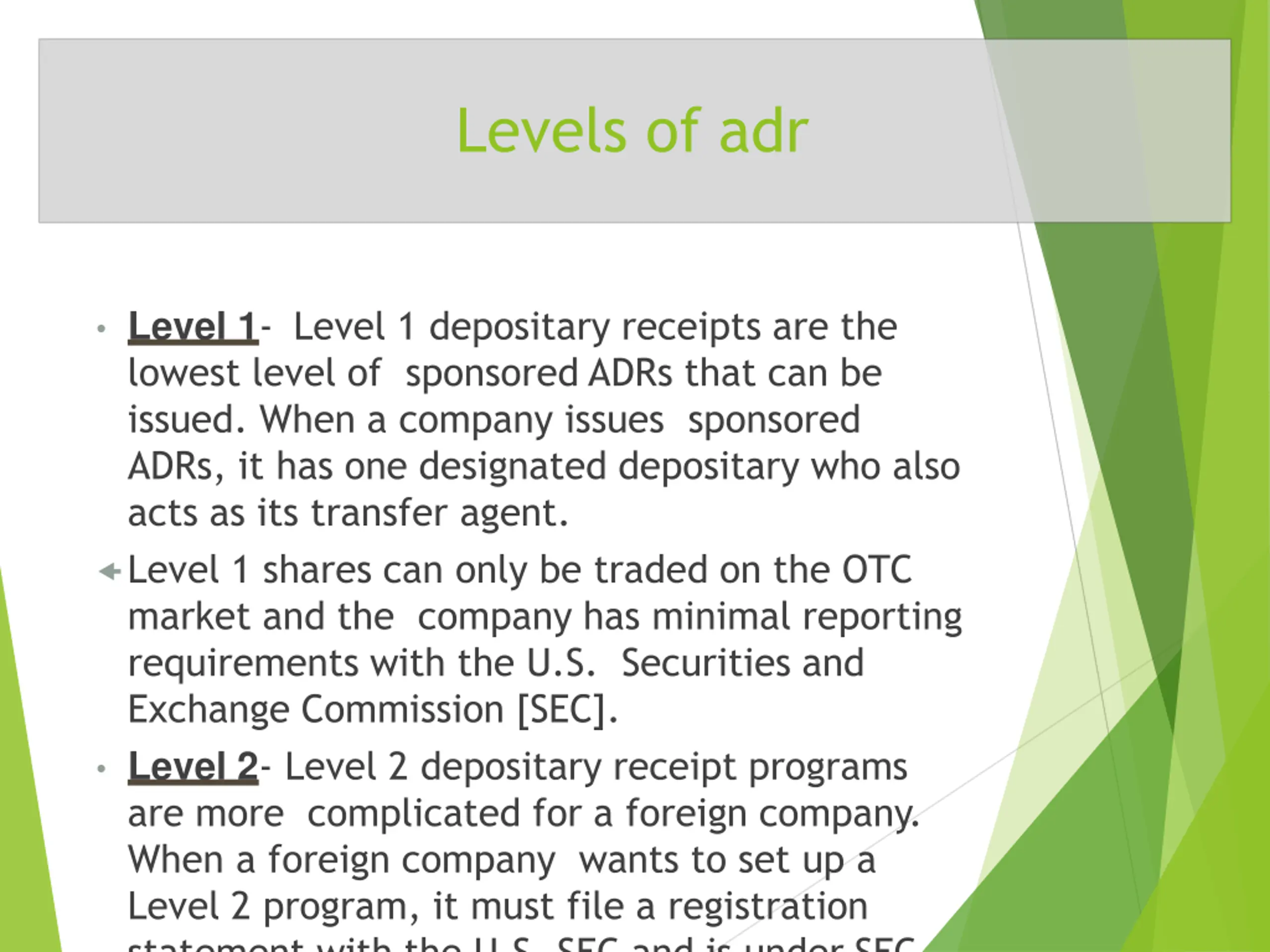 Levels of adr Level 1- Level 1 depositary receipts are the lowest level of sponsored ADRs that can be issued. When a company issues sponsored ADRs, it has one designated depositary who also acts as its transfer agent. Level 1 shares can only be traded on the OTC market and the company has minimal reporting requirements with the U.S. Securities and Exchange Commission [SEC]. Level 2- Level 2 depositary receipt programs are more complicated for a foreign company. When a foreign company wants to set up a Level 2 program, it must file a registration statement with the U.S. SEC and is under SEC