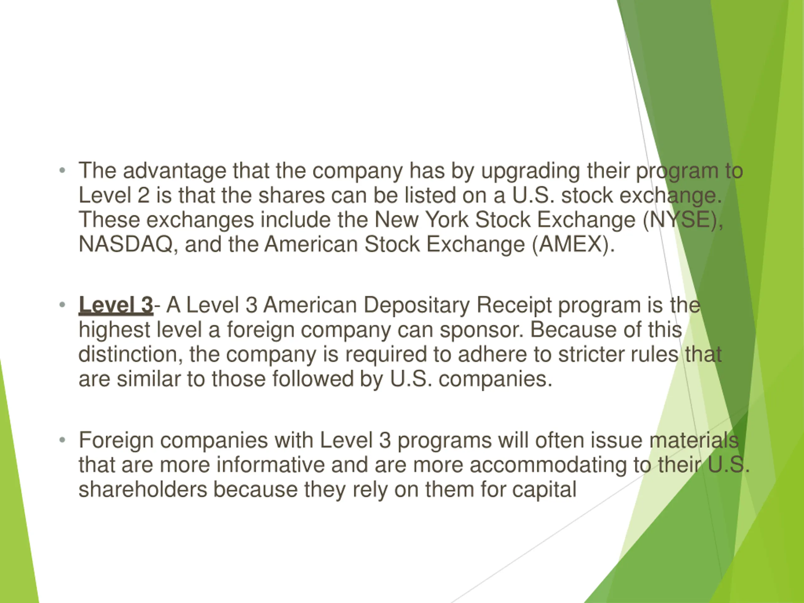 The advantage that the company has by upgrading their program to Level 2 is that the shares can be listed on a U.S. stock exchange. These exchanges include the New York Stock Exchange (NYSE), NASDAQ, and the American Stock Exchange (AMEX). Level 3- A Level 3 American Depositary Receipt program is the highest level a foreign company can sponsor. Because of this distinction, the company is required to adhere to stricter rules that are similar to those followed by U.S. companies. Foreign companies with Level 3 programs will often issue materials that are more informative and are more accommodating to their U.S. shareholders because they rely on them for capital