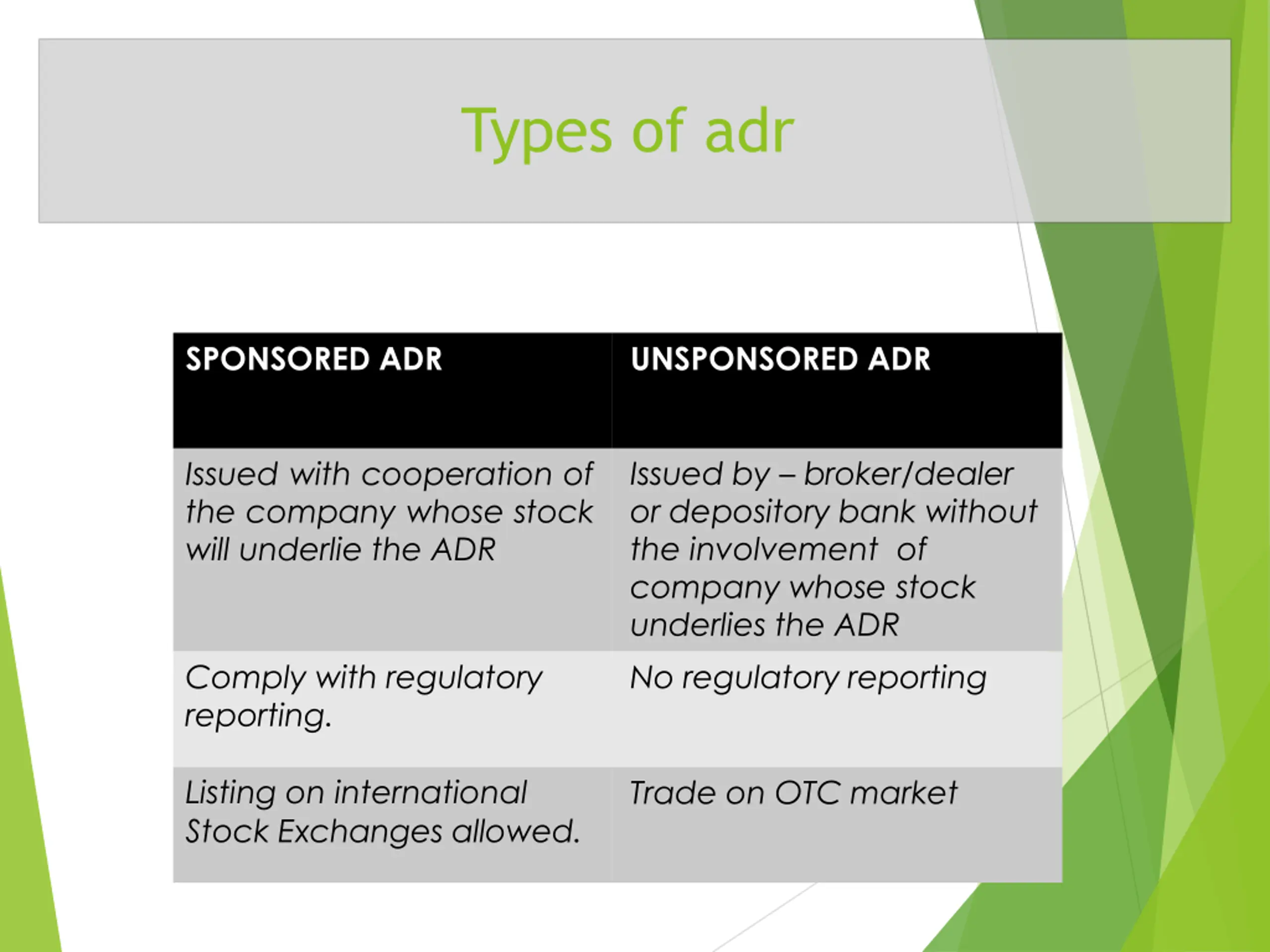 Types of adr SPONSORED ADR UNSPONSORED ADR Issued by broker/dealer or depository bank without the involvement of company whose stock underlies the ADR No regulatory reporting Issued with cooperation of the company whose stock will underlie the ADR Comply with regulatory reporting. Listing on international Stock Exchanges allowed. Trade on OTC market