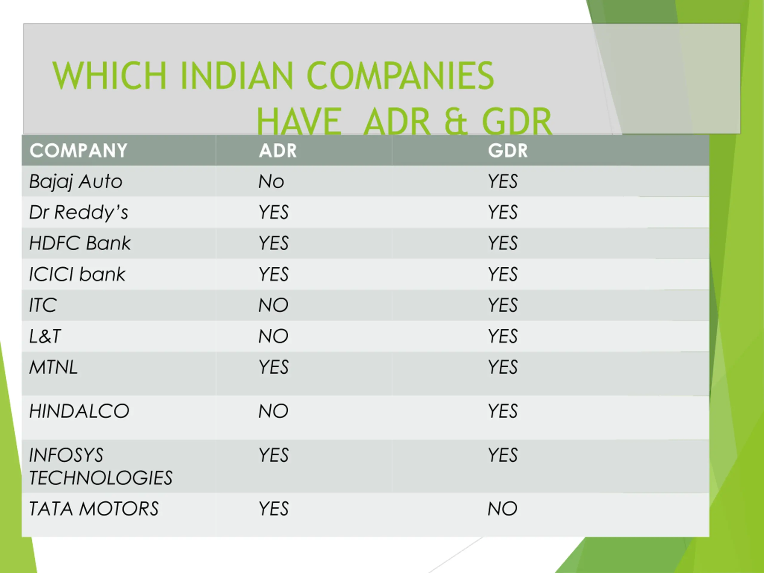 WHICH INDIAN COMPANIES HAVE ADR & GDR COMPANY ADR Bajaj Auto No Dr Reddy s YES HDFC Bank YES ICICI bank YES ITC NO L&T NO MTNL YES GDR YES YES YES YES YES YES YES HINDALCO NO YES INFOSYS TECHNOLOGIES TATA MOTORS YES YES YES NO