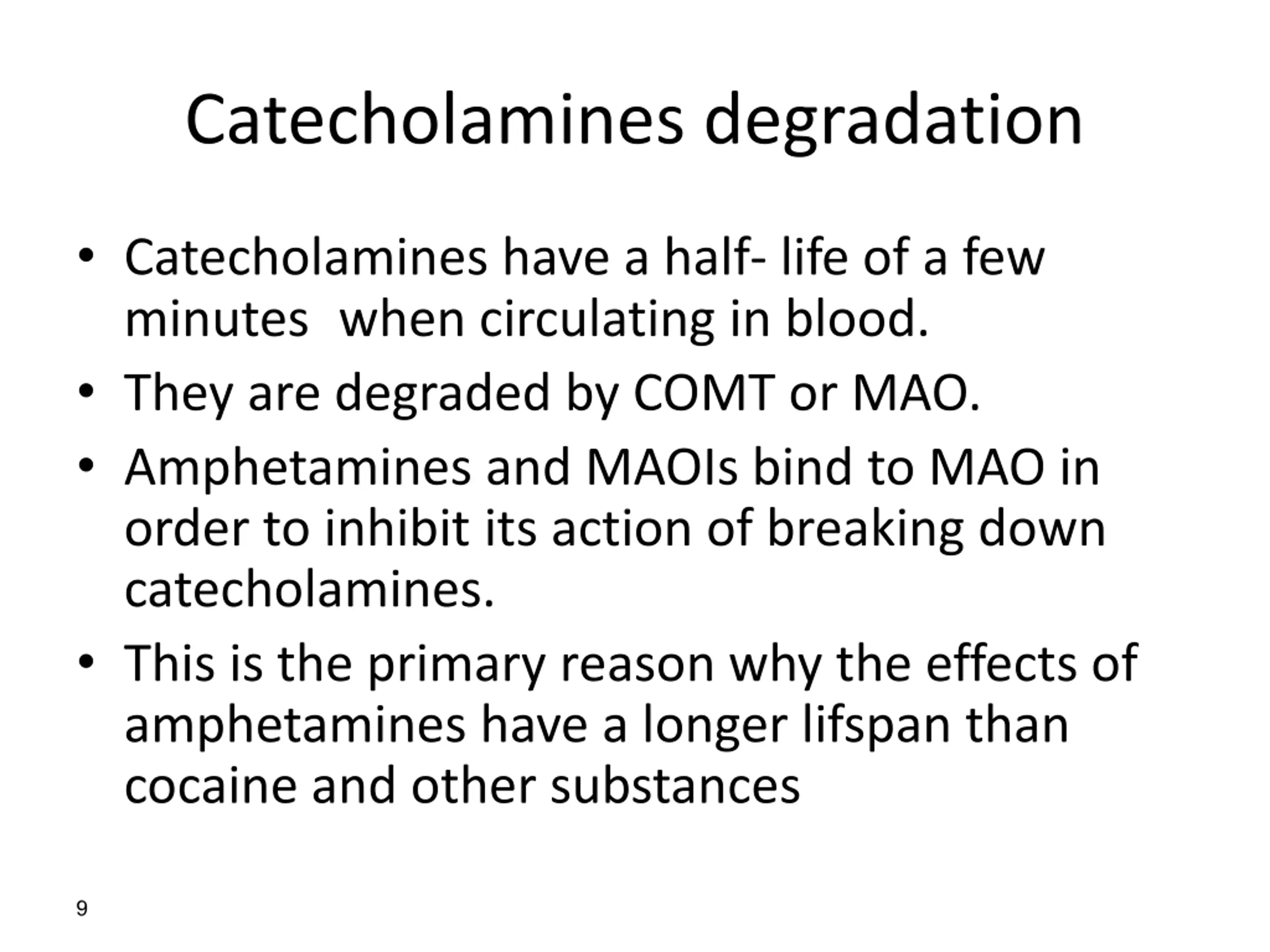 Catecholamines degradation Catecholamines have a half- life of a few minutes when circulating in blood. They are degraded by COMT or MAO. Amphetamines and MAOIs bind to MAO in order to inhibit its action of breaking down catecholamines. This is the primary reason why the effects of amphetamines have a longer lifspan than cocaine and other substances 9