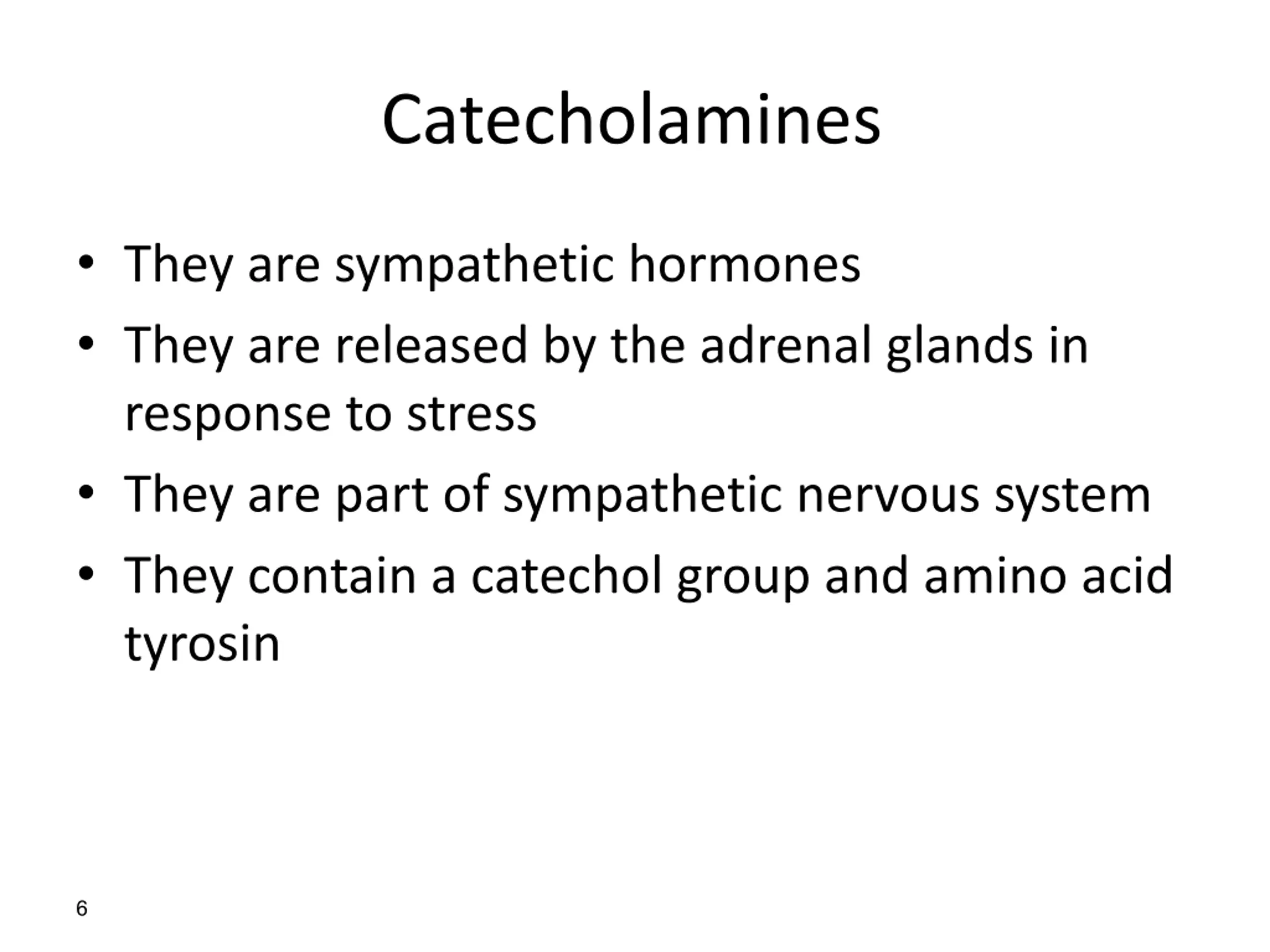 Catecholamines They are sympathetic hormones They are released by the adrenal glands in response to stress They are part of sympathetic nervous system They contain a catechol group and amino acid tyrosin 6