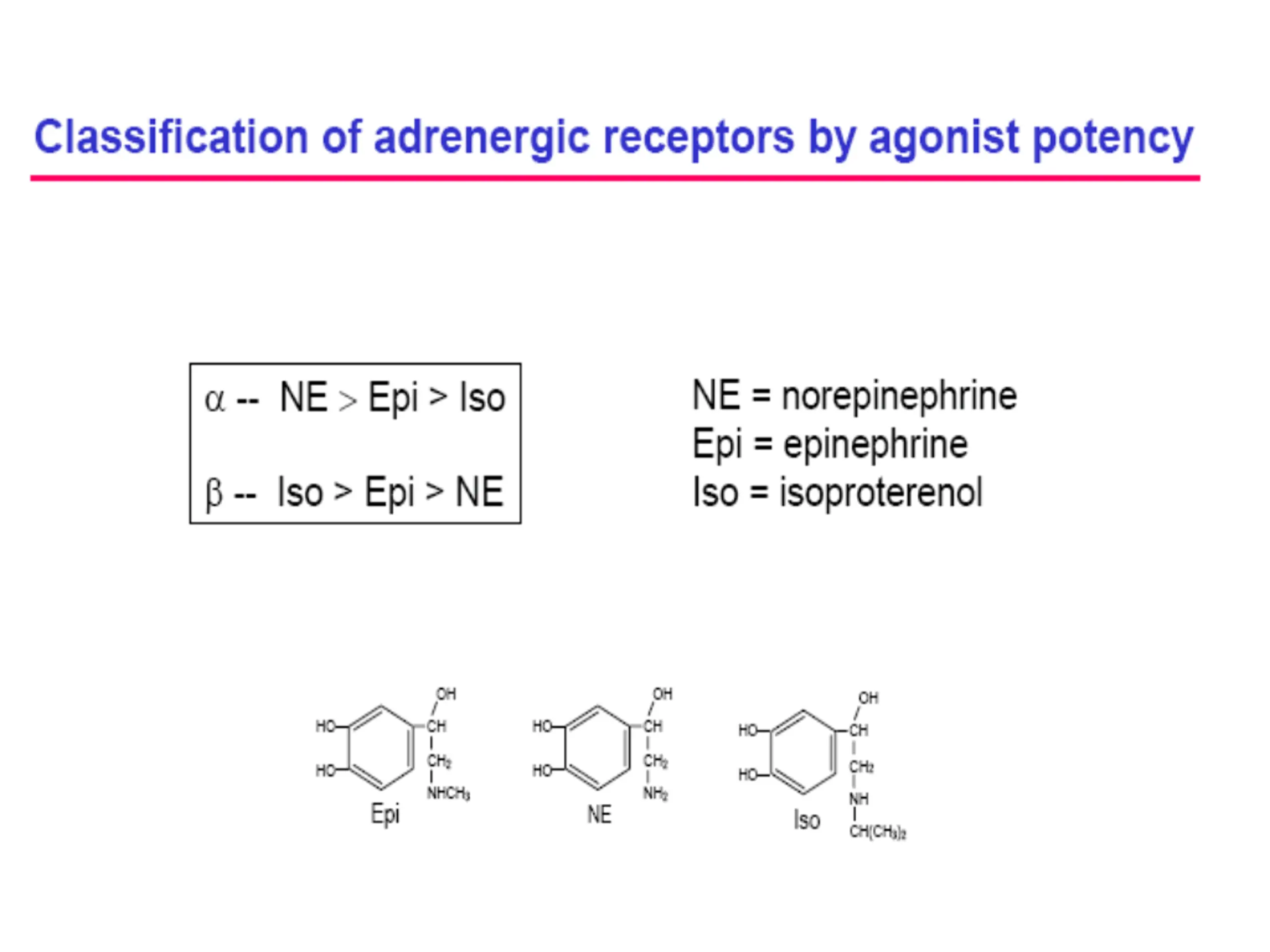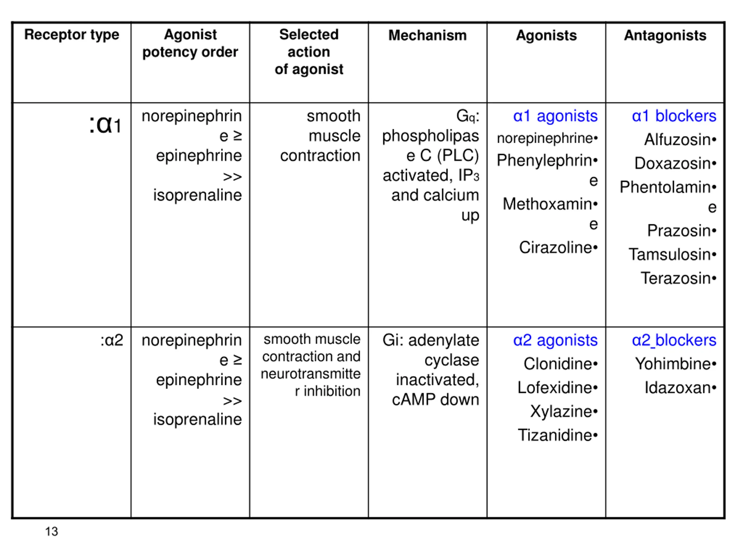Receptor type Agonist potency order Selected action of agonist Mechanism Agonists Antagonists norepinephrin smooth muscle contraction Gq: 1 agonists norepinephrine Phenylephrin 1 blockers Alfuzosin Doxazosin Phentolamin : 1 e phospholipas e C (PLC) activated, IP3 and calcium epinephrine >> e e isoprenaline Methoxamin e up Prazosin Tamsulosin Terazosin Cirazoline 2 norepinephrin Gi: adenylate cyclase inactivated, cAMP down 2 agonists Clonidine Lofexidine Xylazine Tizanidine 2 blockers Yohimbine Idazoxan smooth muscle contraction and neurotransmitte r inhibition : e epinephrine >> isoprenaline 13