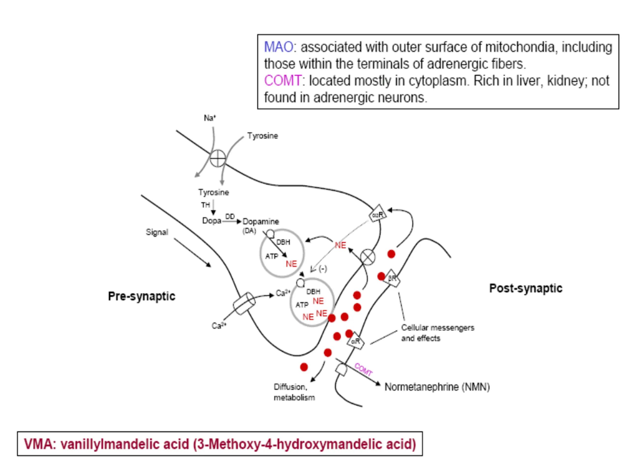 Catecholamine synthesis is inhibited by alpha- methyl-p- tyrosine (AMPT) which inhibits tyrosine hydroxylase. 8