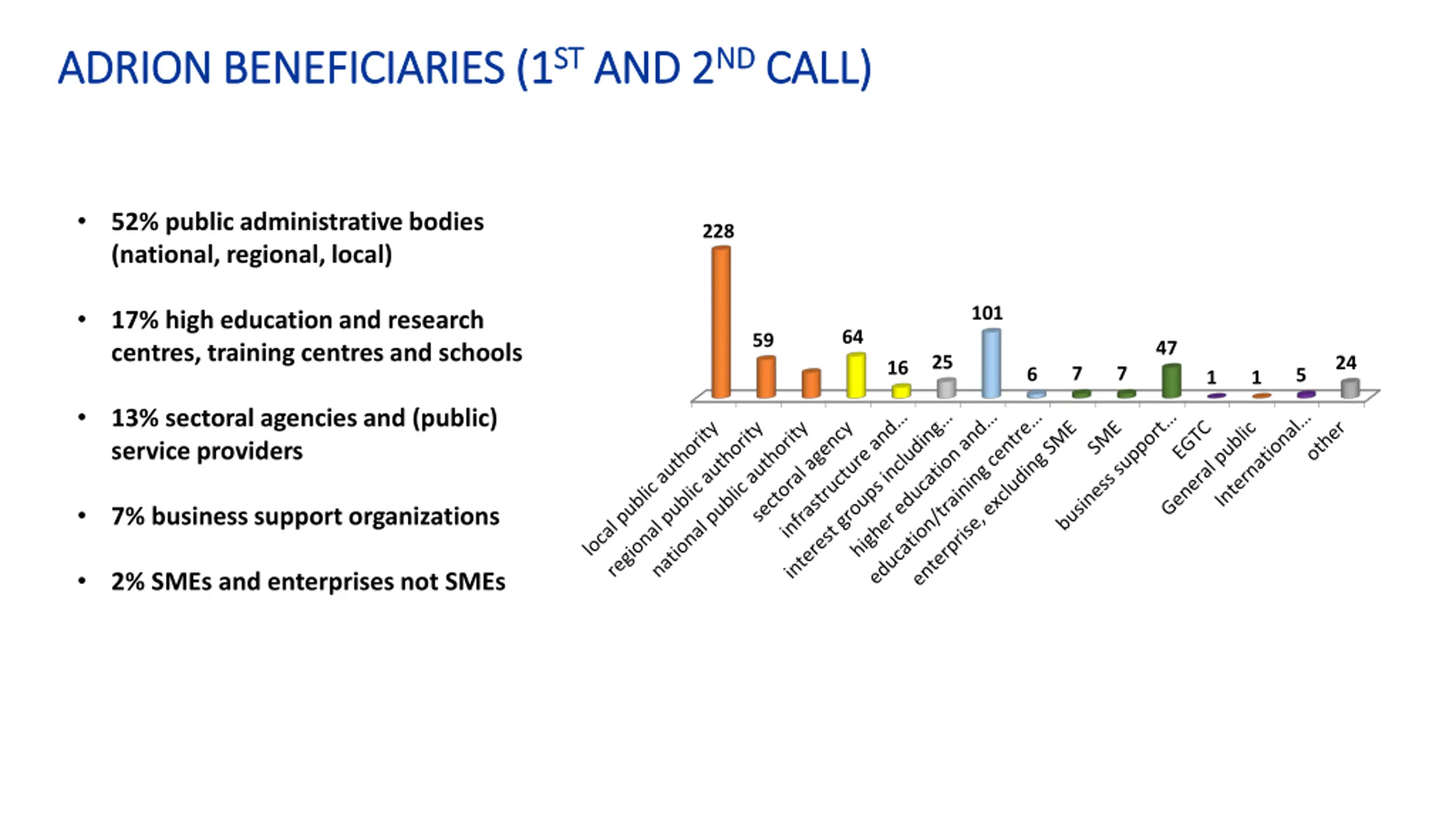 ADRION BENEFICIARIES (1 ADRION BENEFICIARIES (1ST STAND 2 AND 2ND NDCALL) CALL) 52% public administrative bodies (national, regional, local) 228 101 17% high education and research centres, training centres and schools 64 59 47 25 24 16 7 7 6 5 1 1 13% sectoral agencies and (public) service providers 7% business support organizations 2% SMEs and enterprises not SMEs