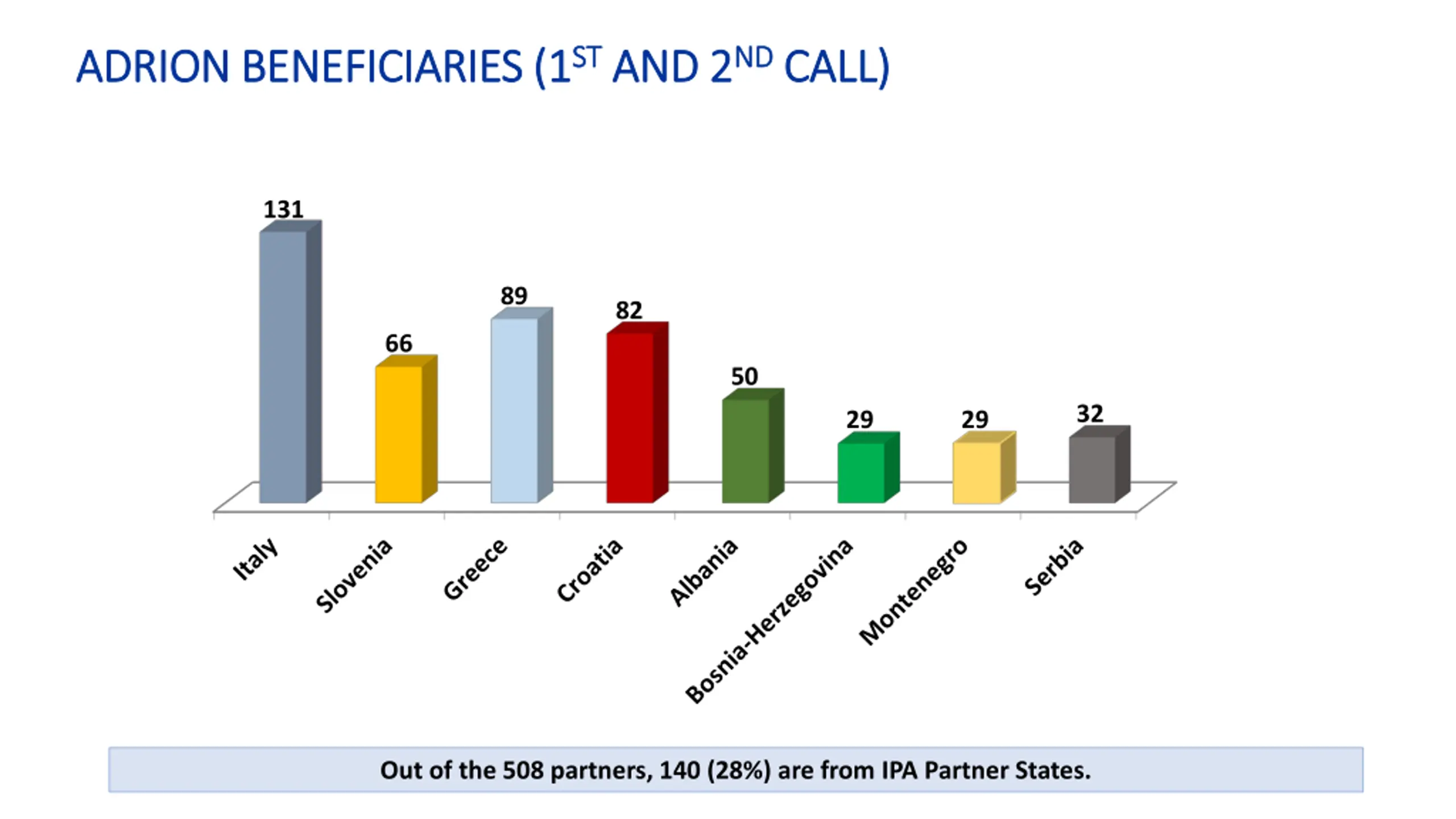 ADRION BENEFICIARIES (1 ADRION BENEFICIARIES (1ST STAND 2 AND 2ND NDCALL) CALL) 131 89 82 66 50 32 29 29 Out of the 508 partners, 140 (28%) are from IPA Partner States.