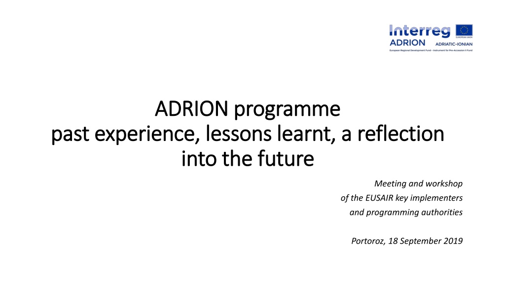ADRION programme ADRION programme past experience, lessons learnt, a reflection past experience, lessons learnt, a reflection into the future into the future Meeting and workshop of the EUSAIR key implementers and programming authorities Portoroz, 18 September 2019
