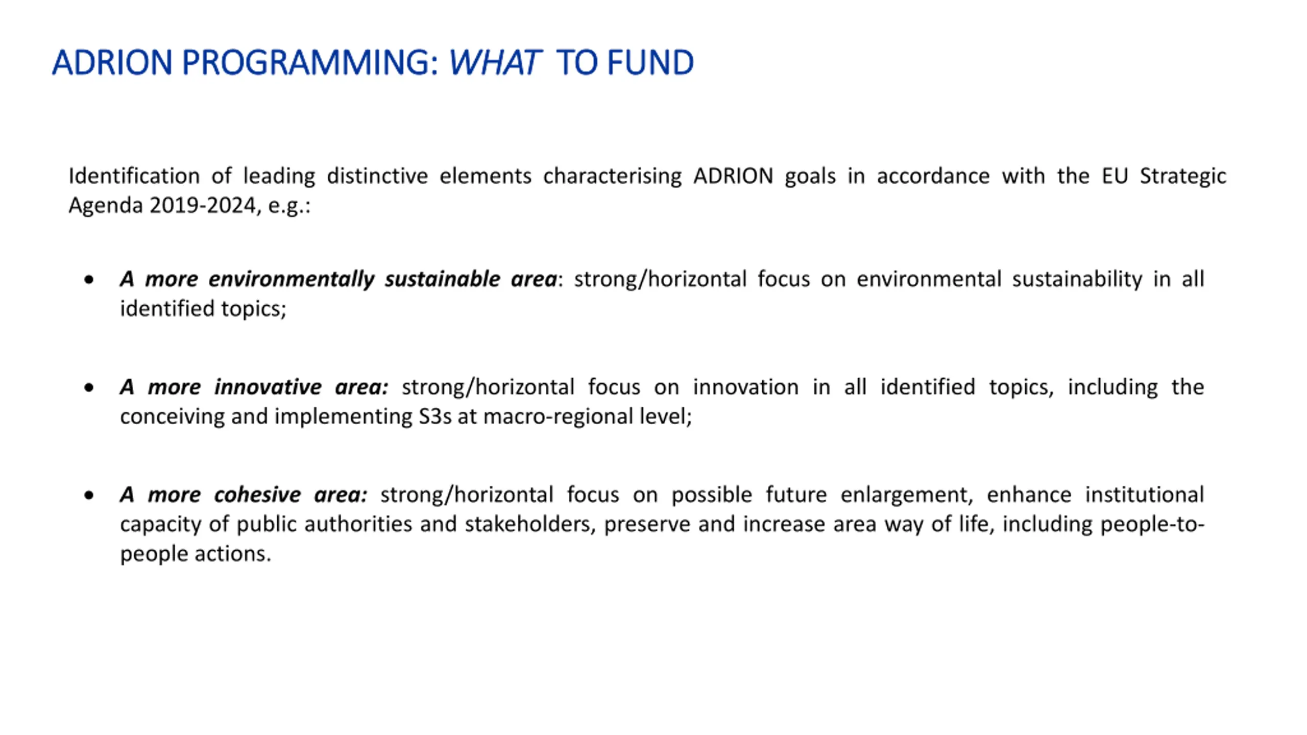 ADRION PROGRAMMING: ADRION PROGRAMMING: WHAT WHAT TO FUND TO FUND Identification of leading distinctive elements characterising ADRION goals in accordance with the EU Strategic Agenda 2019-2024, e.g.: A more environmentally sustainable area: strong/horizontal focus on environmental sustainability in all identified topics; A more innovative area: strong/horizontal focus on innovation in all identified topics, including the conceiving and implementing S3s at macro-regional level; A more cohesive area: strong/horizontal focus on possible future enlargement, enhance institutional capacity of public authorities and stakeholders, preserve and increase area way of life, including people-to- people actions.