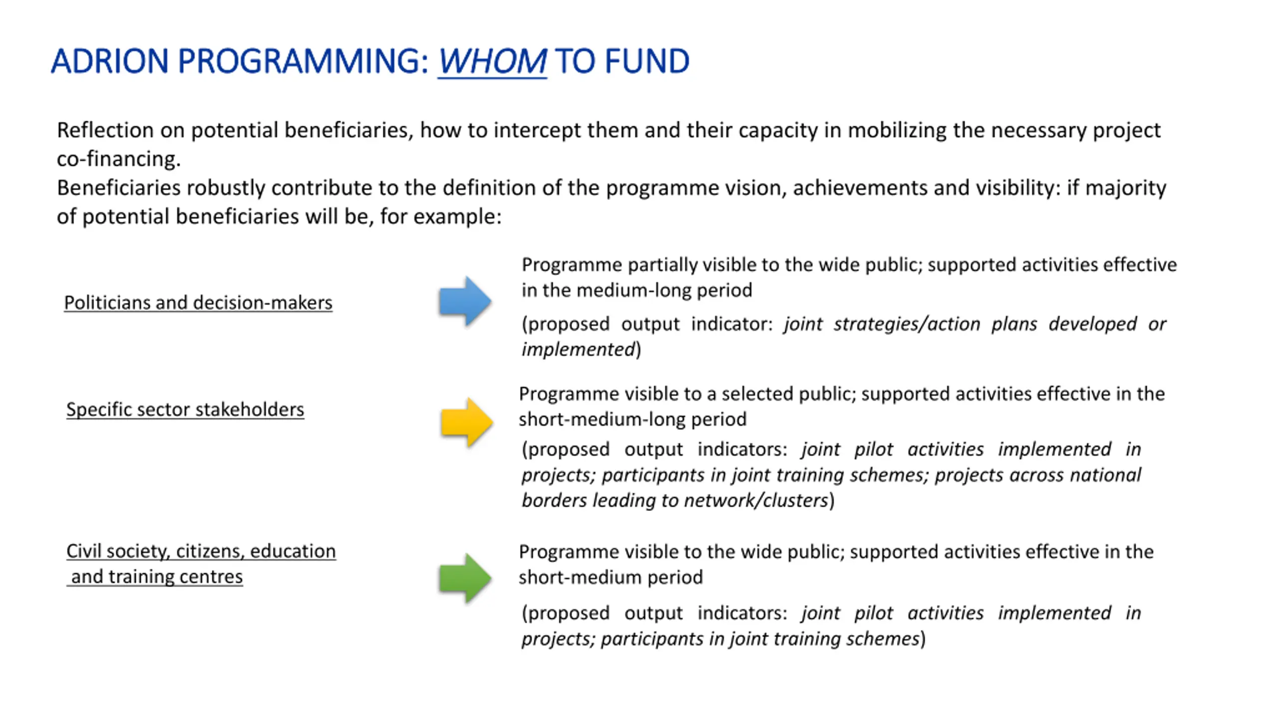 ADRION PROGRAMMING: ADRION PROGRAMMING: WHOM WHOMTO FUND TO FUND Reflection on potential beneficiaries, how to intercept them and their capacity in mobilizing the necessary project co-financing. Beneficiaries robustly contribute to the definition of the programme vision, achievements and visibility: if majority of potential beneficiaries will be, for example: Programme partially visible to the wide public; supported activities effective in the medium-long period Politicians and decision-makers (proposed output indicator: joint strategies/action plans developed or implemented) Programme visible to a selected public; supported activities effective in the short-medium-long period Specific sector stakeholders (proposed output indicators: joint pilot activities implemented in projects; participants in joint training schemes; projects across national borders leading to network/clusters) Civil society, citizens, education and training centres Programme visible to the wide public; supported activities effective in the short-medium period (proposed output indicators: joint pilot activities implemented in projects; participants in joint training schemes)