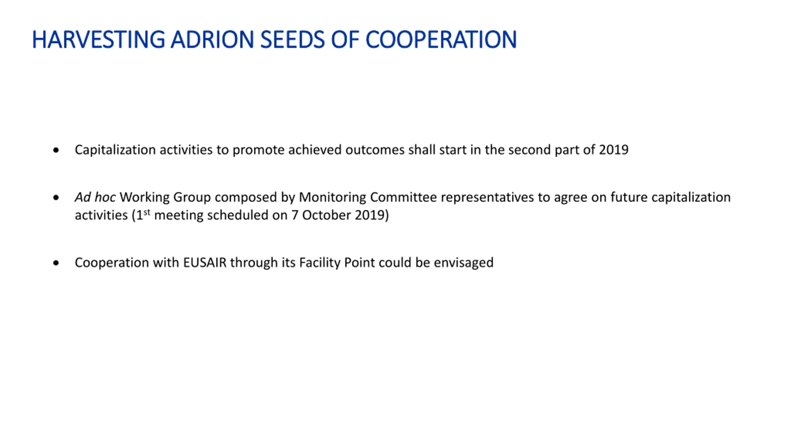 HARVESTING HARVESTINGADRION SEEDS OF COOPERATION ADRION SEEDS OF COOPERATION Capitalization activities to promote achieved outcomes shall start in the second part of 2019 Ad hoc Working Group composed by Monitoring Committee representatives to agree on future capitalization activities (1stmeeting scheduled on 7 October 2019) Cooperation with EUSAIR through its Facility Point could be envisaged