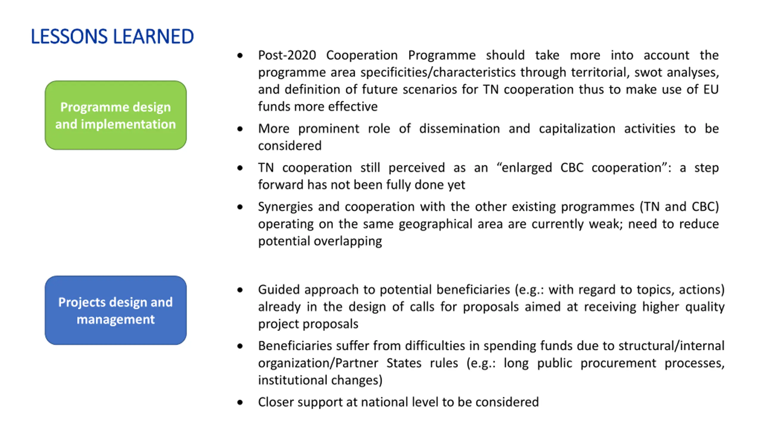LESSONS LEARNED LESSONS LEARNED Post-2020 Cooperation Programme should take more into account the programme area specificities/characteristics through territorial, swot analyses, and definition of future scenarios for TN cooperation thus to make use of EU funds more effective Programme design and implementation More prominent role of dissemination and capitalization activities to be considered TN cooperation still perceived as an enlarged CBC cooperation : a step forward has not been fully done yet Synergies and cooperation with the other existing programmes (TN and CBC) operating on the same geographical area are currently weak; need to reduce potential overlapping Guided approach to potential beneficiaries (e.g.: with regard to topics, actions) already in the design of calls for proposals aimed at receiving higher quality project proposals Projects design and management Beneficiaries suffer from difficulties in spending funds due to structural/internal organization/Partner States rules (e.g.: long public procurement processes, institutional changes) Closer support at national level to be considered