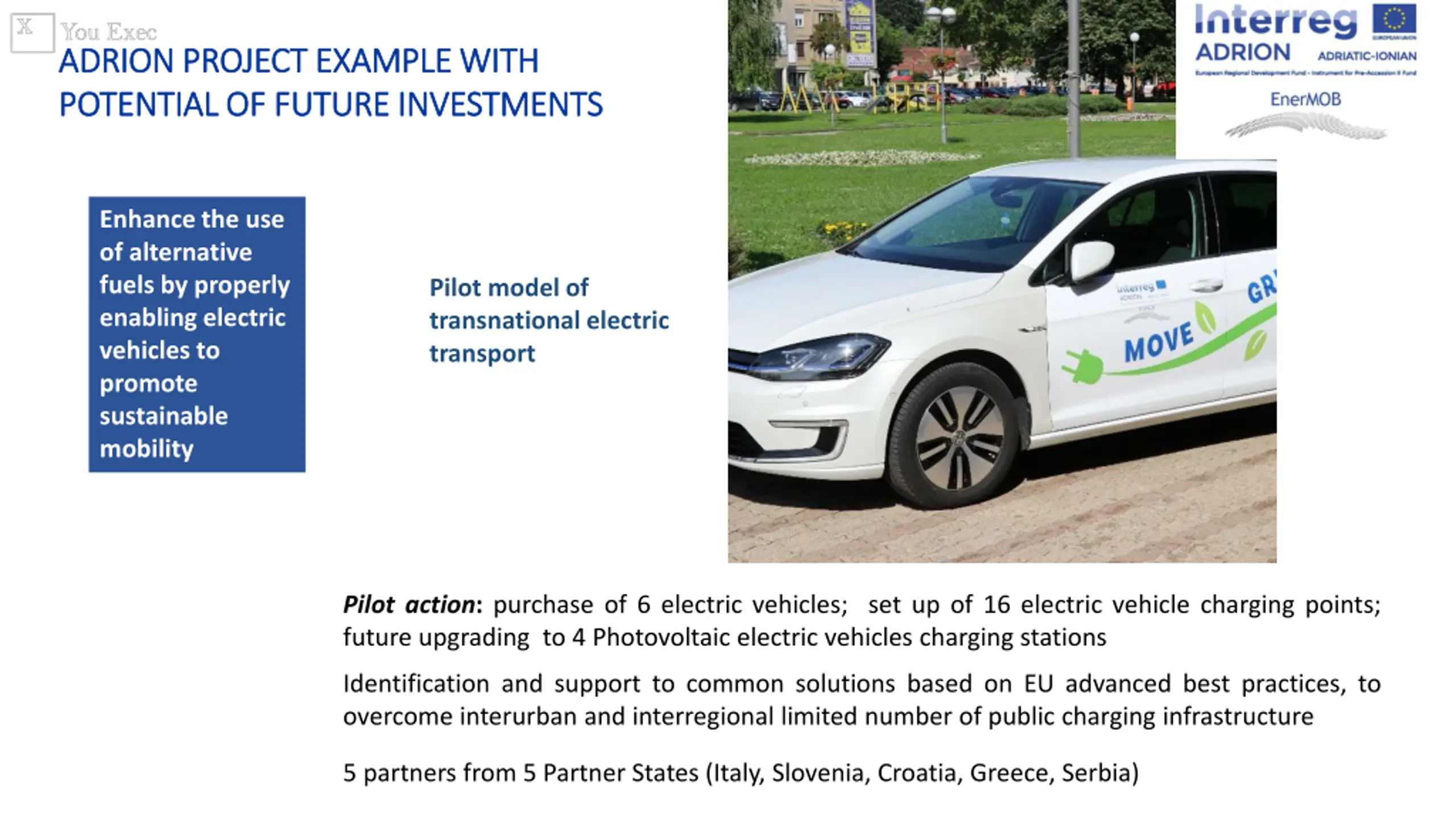 logo-long-white.png ADRION ADRION PROJECT EXAMPLE WITH PROJECT EXAMPLE WITH POTENTIAL OF FUTURE INVESTMENTS POTENTIAL OF FUTURE INVESTMENTS Enhance the use of alternative fuels by properly enabling electric vehicles to promote sustainable mobility Pilot model of transnational electric transport Pilot action: purchase of 6 electric vehicles; set up of 16 electric vehicle charging points; future upgrading to 4 Photovoltaic electric vehicles charging stations Identification and support to common solutions based on EU advanced best practices, to overcome interurban and interregional limited number of public charging infrastructure 5 partners from 5 Partner States (Italy, Slovenia, Croatia, Greece, Serbia)
