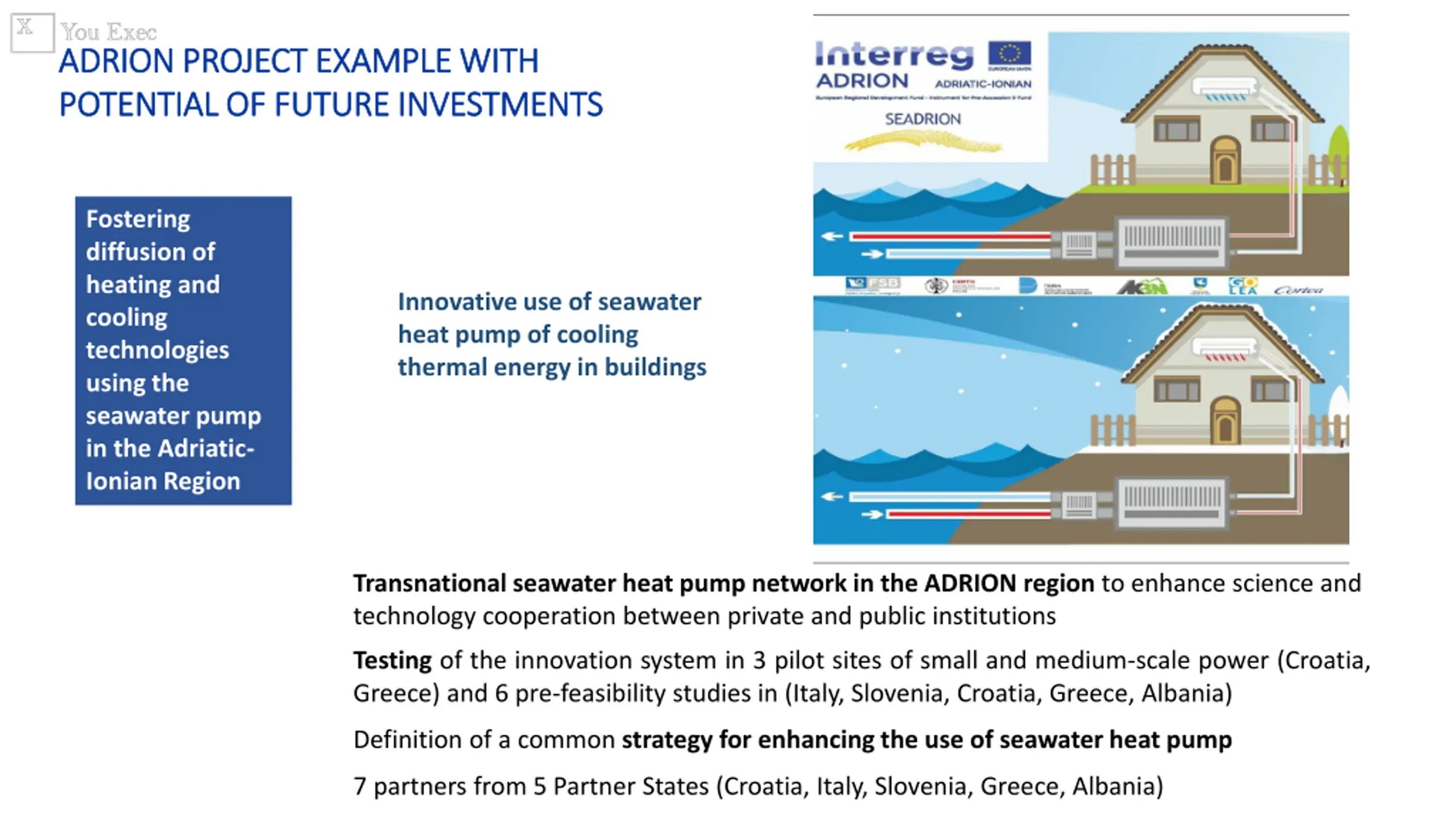 logo-long-white.png ADRION ADRION PROJECT EXAMPLE WITH PROJECT EXAMPLE WITH POTENTIAL OF FUTURE INVESTMENTS POTENTIAL OF FUTURE INVESTMENTS Fostering diffusion of heating and cooling technologies using the seawater pump in the Adriatic- Ionian Region Innovative use of seawater heat pump of cooling thermal energy in buildings Transnational seawater heat pump network in the ADRION region to enhance science and technology cooperation between private and public institutions Testing of the innovation system in 3 pilot sites of small and medium-scale power (Croatia, Greece) and 6 pre-feasibility studies in (Italy, Slovenia, Croatia, Greece, Albania) Definition of a common strategy for enhancing the use of seawater heat pump 7 partners from 5 Partner States (Croatia, Italy, Slovenia, Greece, Albania)