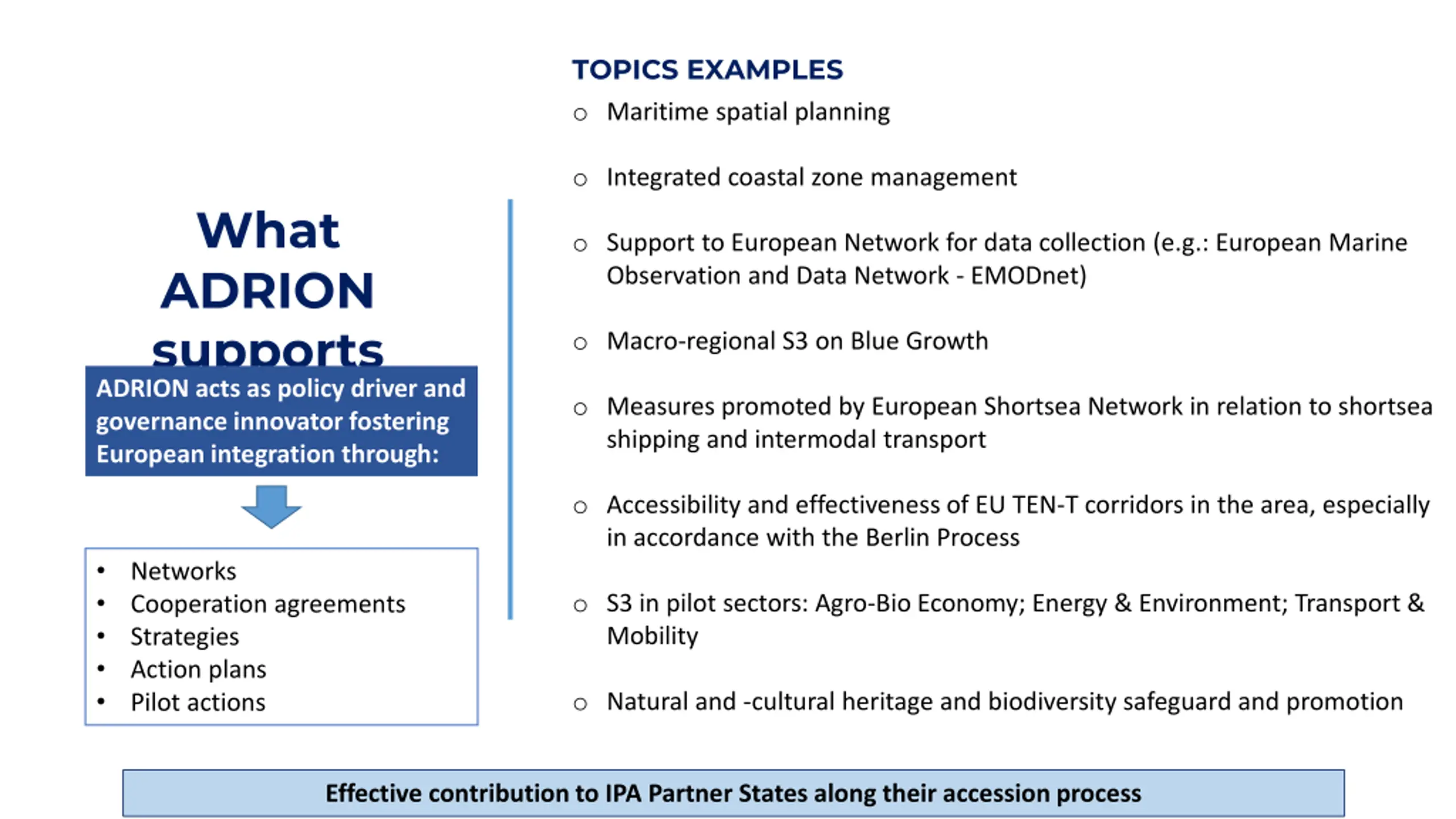 TOPICS EXAMPLES o Maritime spatial planning o Integrated coastal zone management What ADRION supports ADRION acts as policy driver and governance innovator fostering European integration through: o Support to European Network for data collection (e.g.: European Marine Observation and Data Network - EMODnet) o Macro-regional S3 on Blue Growth o Measures promoted by European Shortsea Network in relation to shortsea shipping and intermodal transport o Accessibility and effectiveness of EU TEN-T corridors in the area, especially in accordance with the Berlin Process Networks Cooperation agreements Strategies Action plans Pilot actions o S3 in pilot sectors: Agro-Bio Economy; Energy & Environment; Transport & Mobility o Natural and -cultural heritage and biodiversity safeguard and promotion Effective contribution to IPA Partner States along their accession process