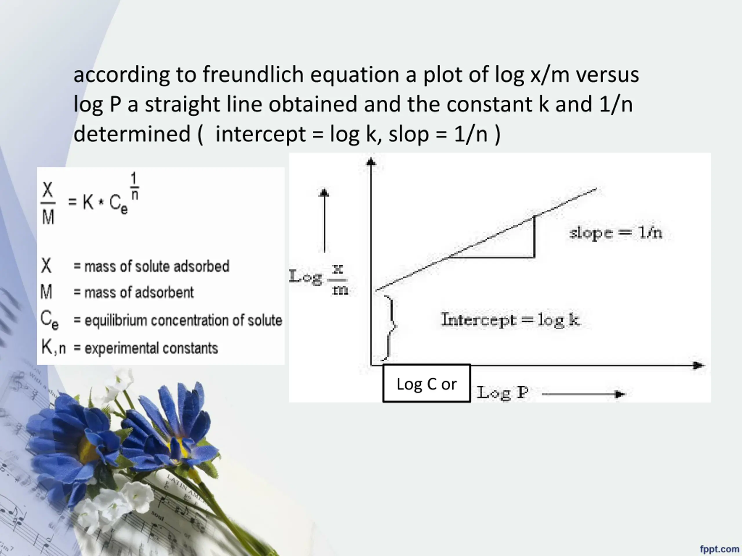 according to freundlich equation a plot of log x/m versus log P a straight line obtained and the constant k and 1/n determined ( intercept = log k, slop = 1/n ) Log C or