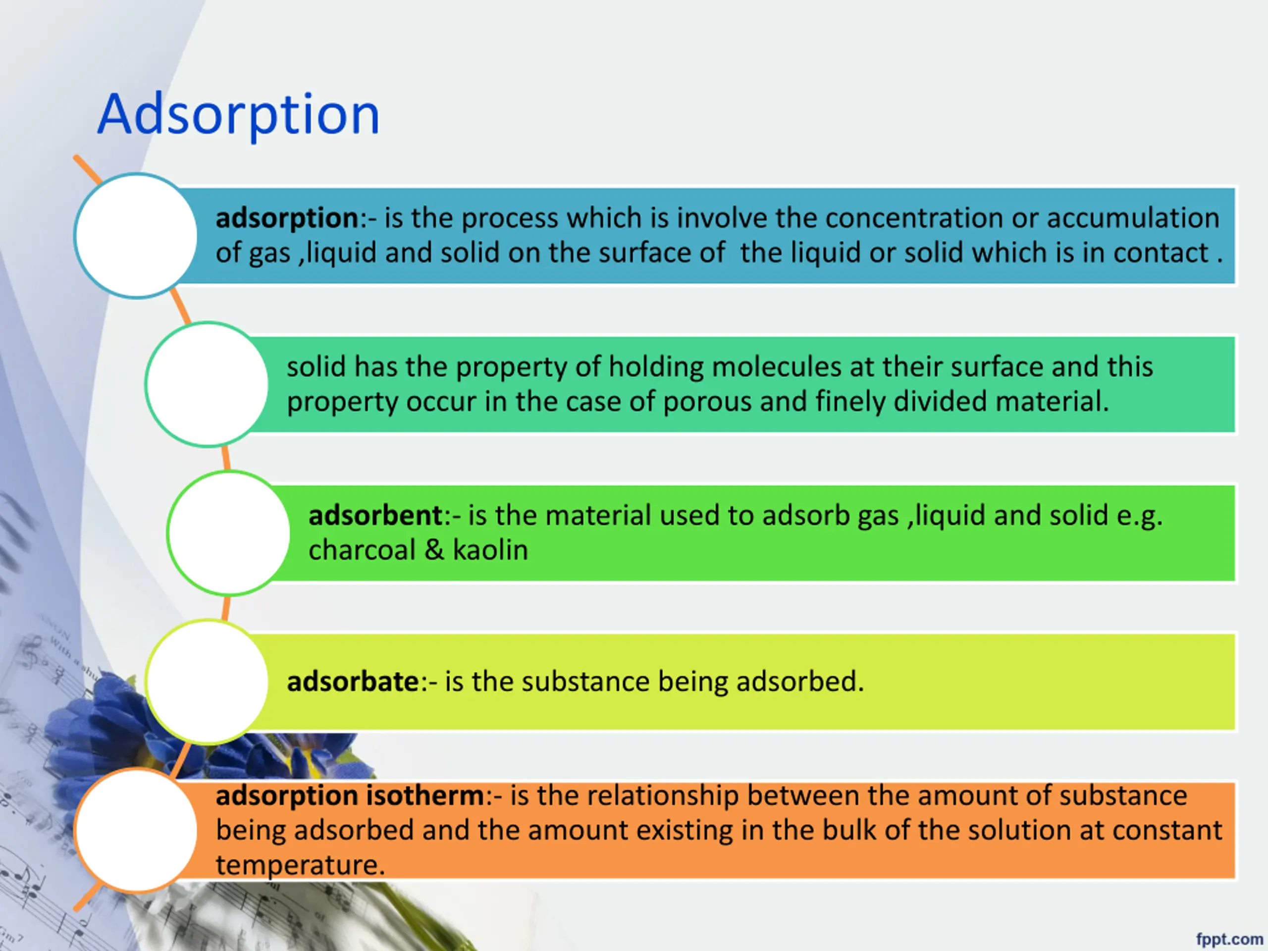Adsorption adsorption:- is the process which is involve the concentration or accumulation of gas ,liquid and solid on the surface of the liquid or solid which is in contact . solid has the property of holding molecules at their surface and this property occur in the case of porous and finely divided material. adsorbent:- is the material used to adsorb gas ,liquid and solid e.g. charcoal & kaolin adsorbate:- is the substance being adsorbed. adsorption isotherm:- is the relationship between the amount of substance being adsorbed and the amount existing in the bulk of the solution at constant temperature.