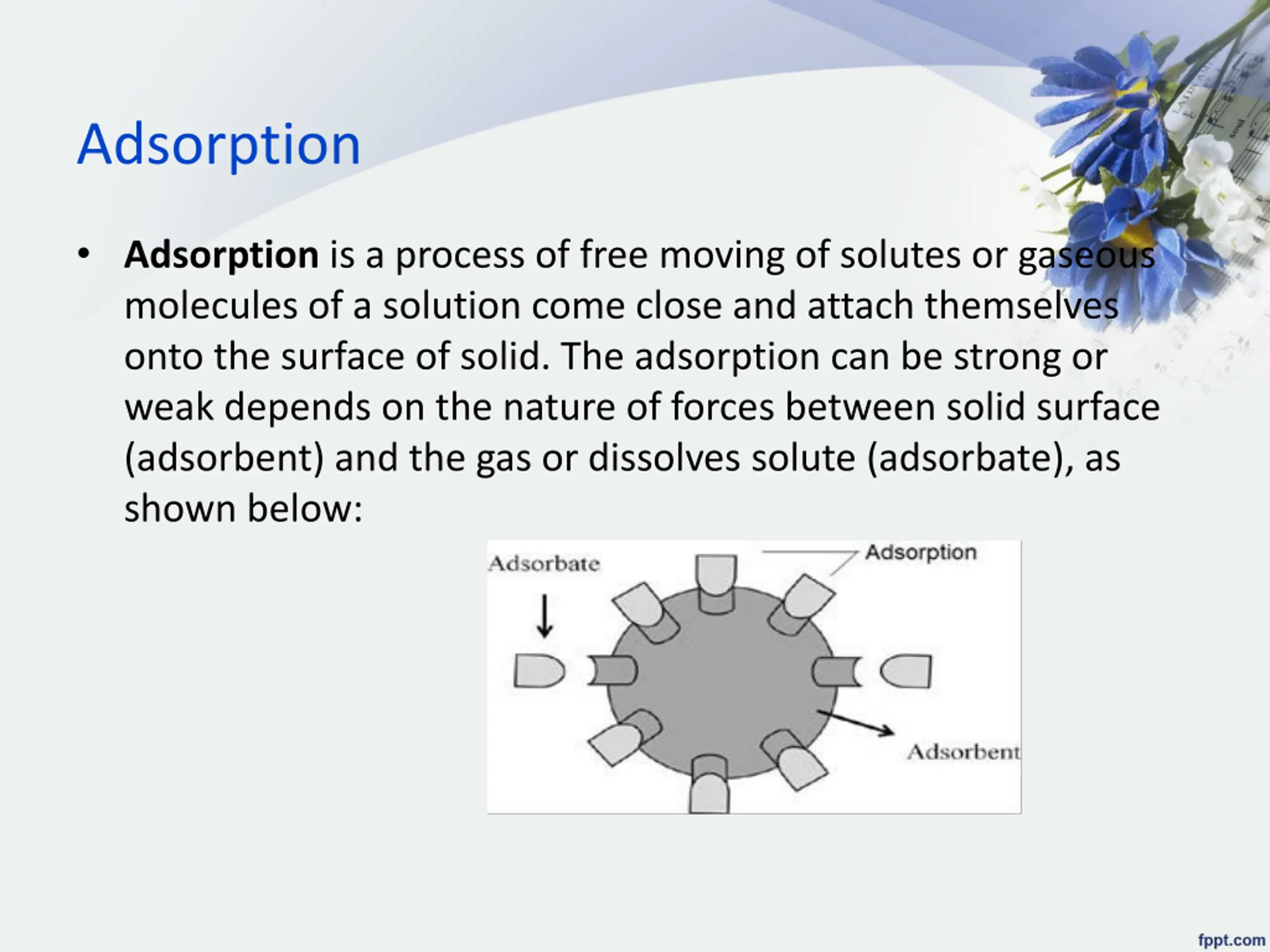 Adsorption Adsorption is a process of free moving of solutes or gaseous molecules of a solution come close and attach themselves onto the surface of solid. The adsorption can be strong or weak depends on the nature of forces between solid surface (adsorbent) and the gas or dissolves solute (adsorbate), as shown below: