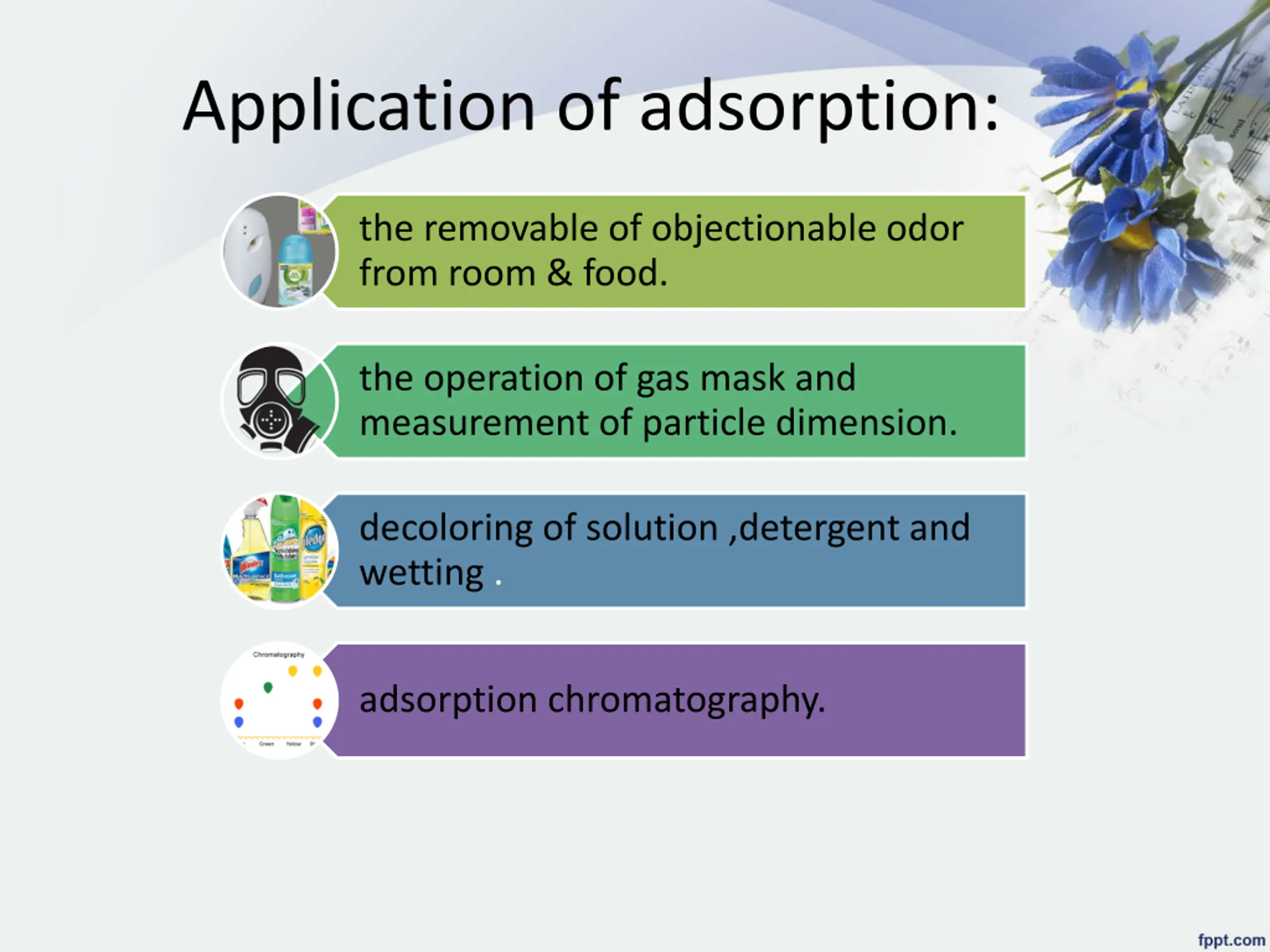 Application of adsorption: the removable of objectionable odor from room & food. the operation of gas mask and measurement of particle dimension. decoloring of solution ,detergent and wetting . adsorption chromatography.
