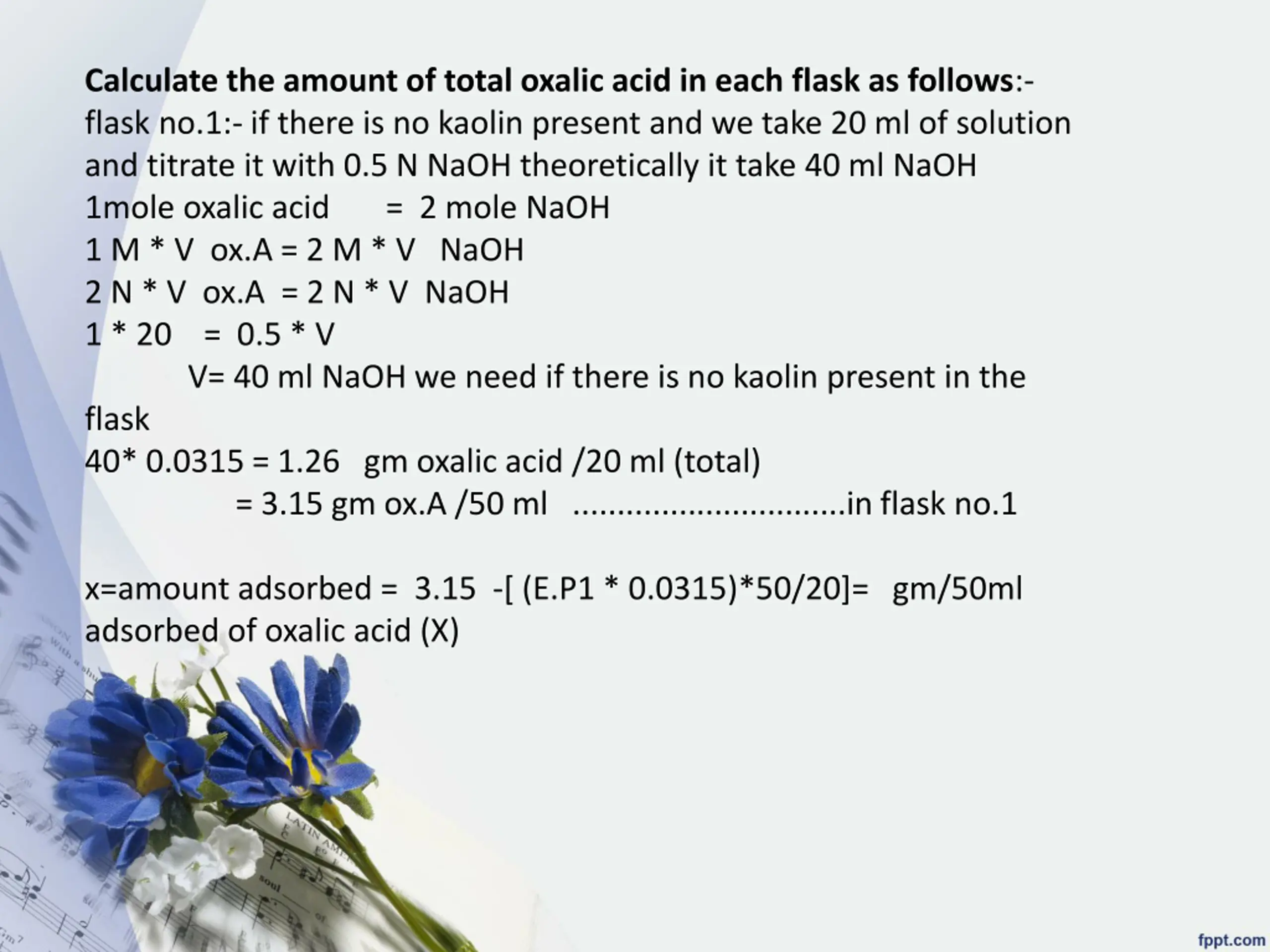 Calculate the amount of total oxalic acid in each flask as follows:- flask no.1:- if there is no kaolin present and we take 20 ml of solution and titrate it with 0.5 N NaOH theoretically it take 40 ml NaOH 1mole oxalic acid = 2 mole NaOH 1 M * V ox.A = 2 M * V NaOH 2 N * V ox.A = 2 N * V NaOH 1 * 20 = 0.5 * V V= 40 ml NaOH we need if there is no kaolin present in the flask 40* 0.0315 = 1.26 gm oxalic acid /20 ml (total) = 3.15 gm ox.A /50 ml ...............................in flask no.1 x=amount adsorbed = 3.15 -[ (E.P1 * 0.0315)*50/20]= gm/50ml adsorbed of oxalic acid (X)