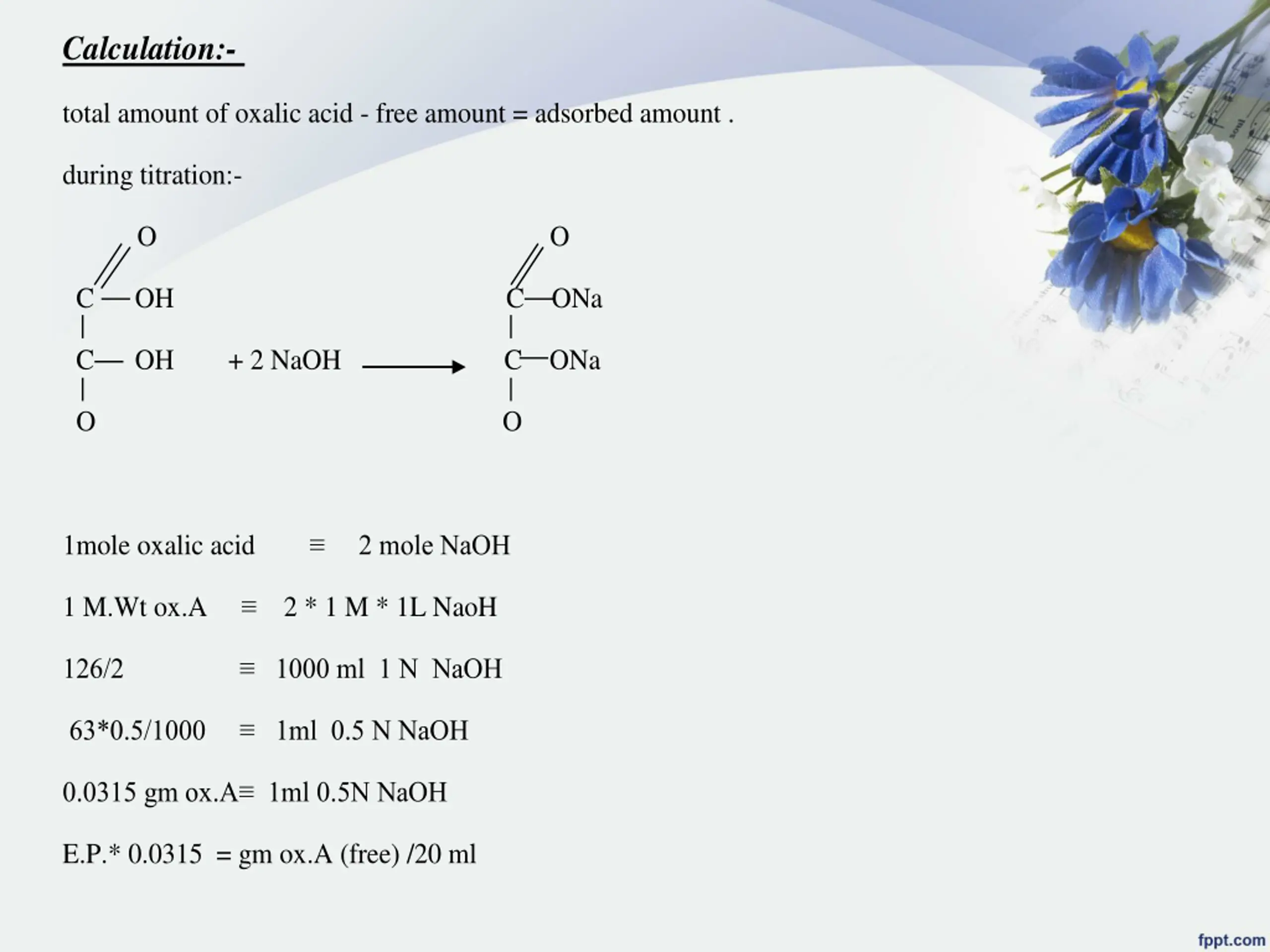Calculation:- total amount of oxalic acid - free amount = adsorbed amount . during titration:- O O C OH C ONa C OH + 2 NaOH C ONa O O 1mole oxalic acid 2 mole NaOH 1 M.Wt ox.A 2 * 1 M * 1L NaoH 126/2 1000 ml 1 N NaOH 63*0.5/1000 1ml 0.5 N NaOH 0.0315 gm ox.A 1ml 0.5N NaOH E.P.* 0.0315 = gm ox.A (free) /20 ml