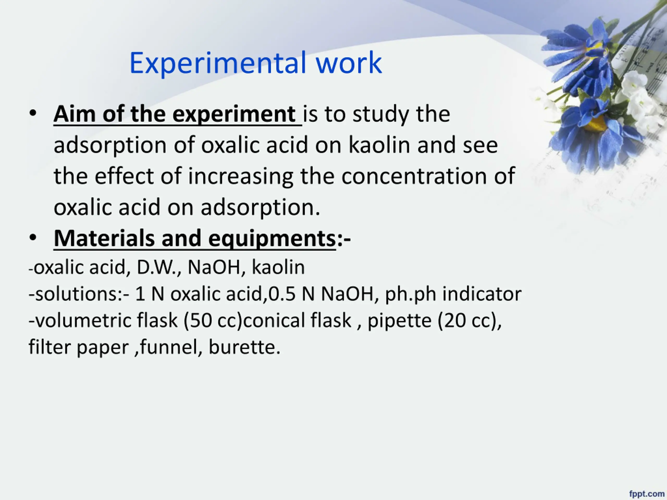 Experimental work Aim of the experiment is to study the adsorption of oxalic acid on kaolin and see the effect of increasing the concentration of oxalic acid on adsorption. Materials and equipments:- -oxalic acid, D.W., NaOH, kaolin -solutions:- 1 N oxalic acid,0.5 N NaOH, ph.ph indicator -volumetric flask (50 cc)conical flask , pipette (20 cc), filter paper ,funnel, burette.
