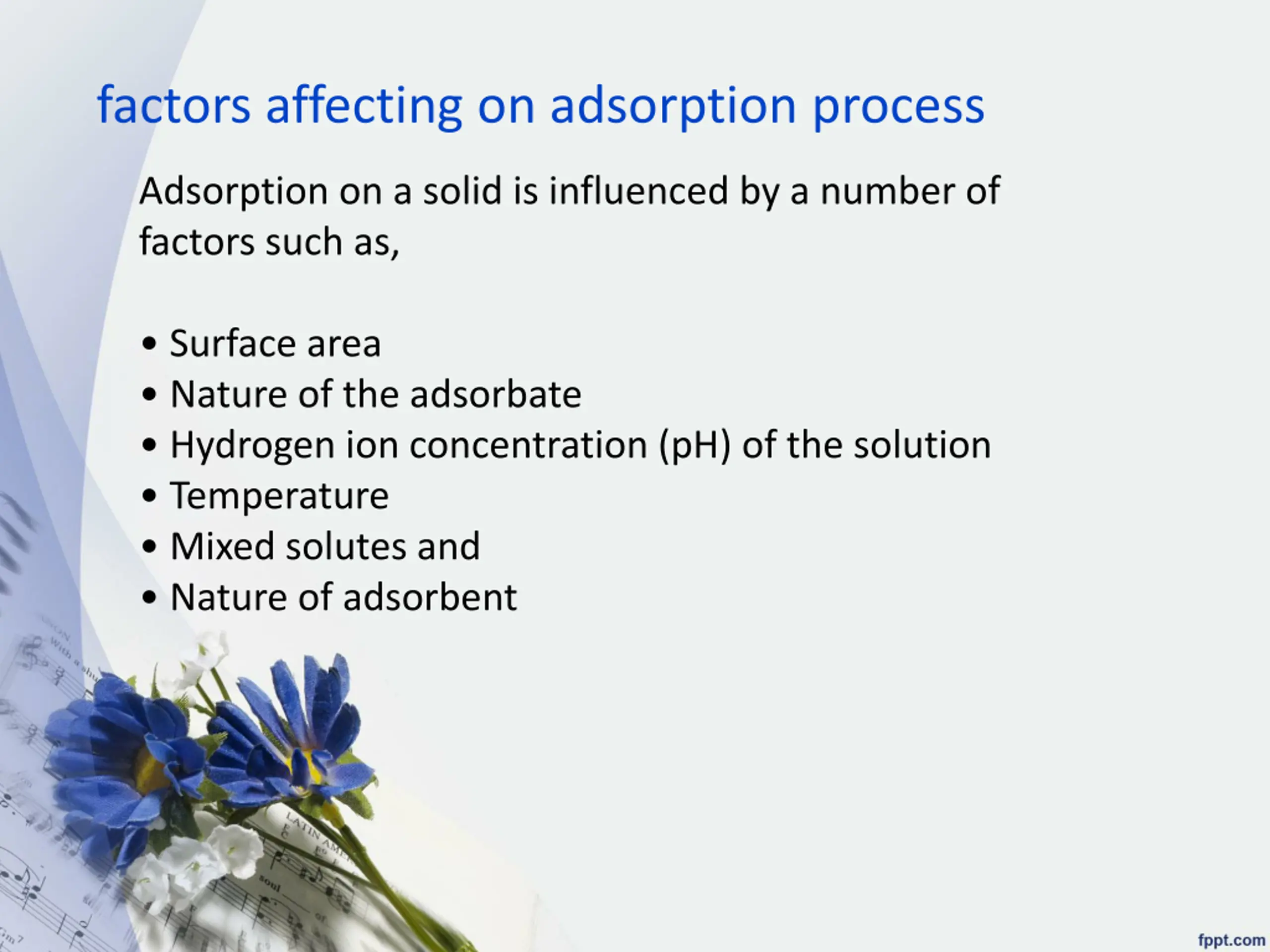 factors affecting on adsorption process Adsorption on a solid is influenced by a number of factors such as, Surface area Nature of the adsorbate Hydrogen ion concentration (pH) of the solution Temperature Mixed solutes and Nature of adsorbent