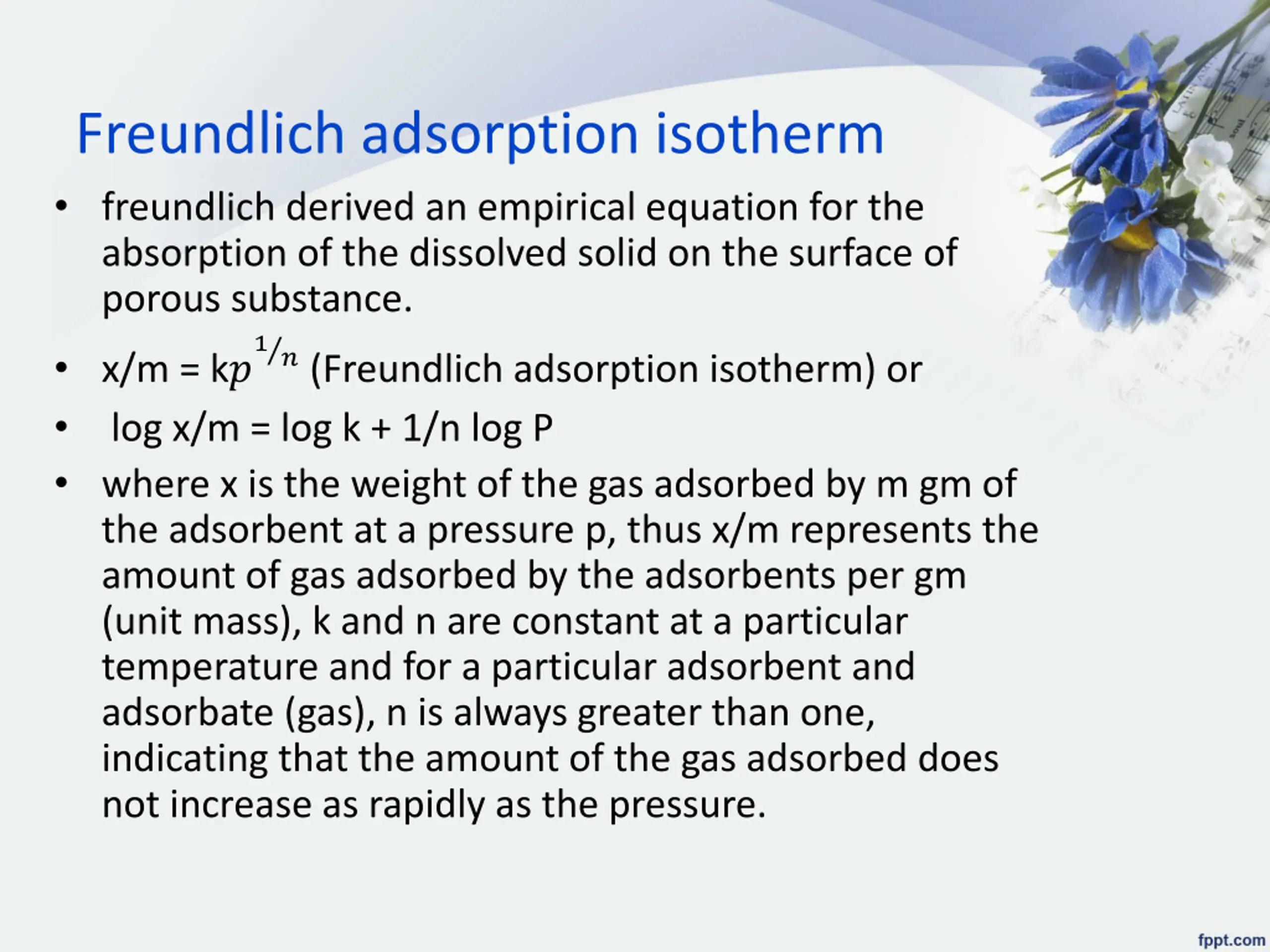 Freundlich adsorption isotherm freundlich derived an empirical equation for the absorption of the dissolved solid on the surface of porous substance. x/m = k? log x/m = log k + 1/n log P where x is the weight of the gas adsorbed by m gm of the adsorbent at a pressure p, thus x/m represents the amount of gas adsorbed by the adsorbents per gm (unit mass), k and n are constant at a particular temperature and for a particular adsorbent and adsorbate (gas), n is always greater than one, indicating that the amount of the gas adsorbed does not increase as rapidly as the pressure. 1?(Freundlich adsorption isotherm) or