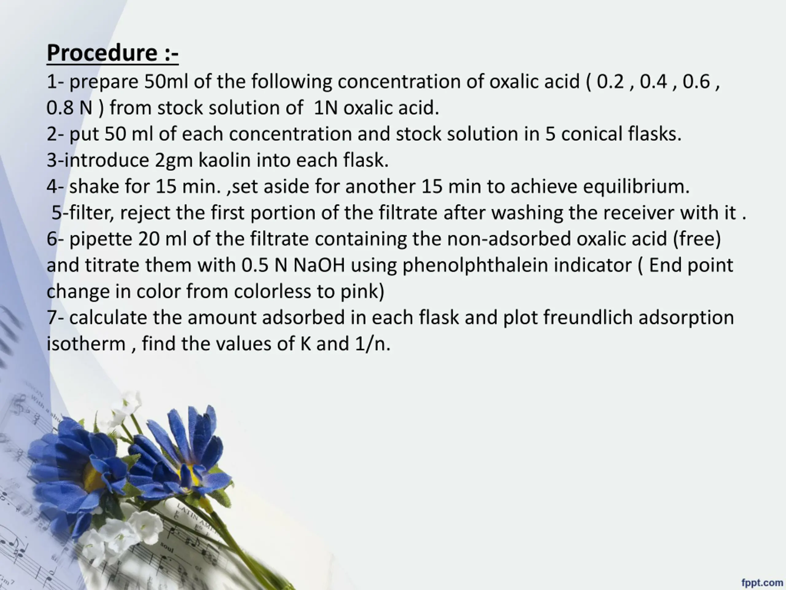 Procedure :- 1- prepare 50ml of the following concentration of oxalic acid ( 0.2 , 0.4 , 0.6 , 0.8 N ) from stock solution of 1N oxalic acid. 2- put 50 ml of each concentration and stock solution in 5 conical flasks. 3-introduce 2gm kaolin into each flask. 4- shake for 15 min. ,set aside for another 15 min to achieve equilibrium. 5-filter, reject the first portion of the filtrate after washing the receiver with it . 6- pipette 20 ml of the filtrate containing the non-adsorbed oxalic acid (free) and titrate them with 0.5 N NaOH using phenolphthalein indicator ( End point change in color from colorless to pink) 7- calculate the amount adsorbed in each flask and plot freundlich adsorption isotherm , find the values of K and 1/n.