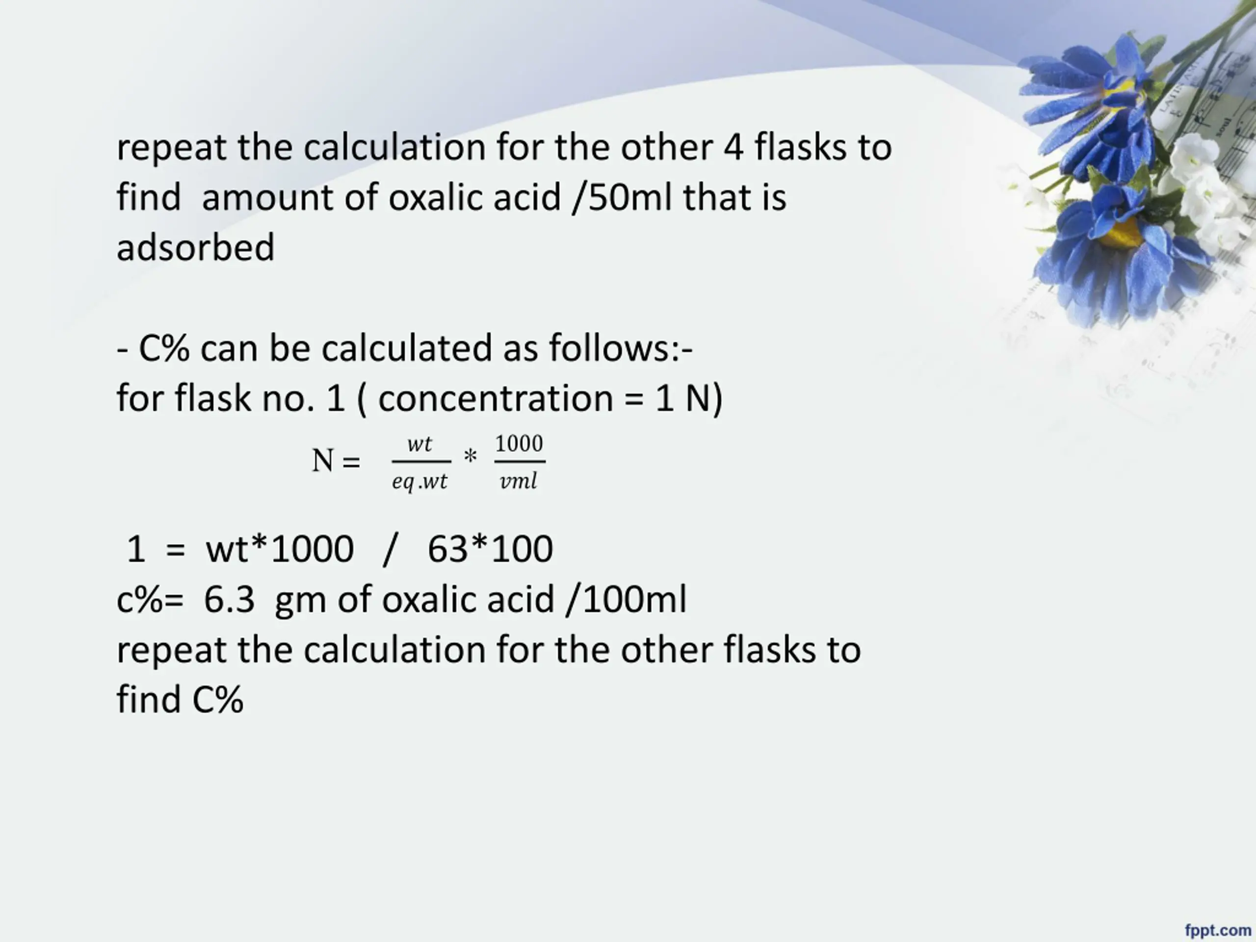 repeat the calculation for the other 4 flasks to find amount of oxalic acid /50ml that is adsorbed - C% can be calculated as follows:- for flask no. 1 ( concentration = 1 N) ?? * 1000 ??? N = ??.?? 1 = wt*1000 / 63*100 c%= 6.3 gm of oxalic acid /100ml repeat the calculation for the other flasks to find C%