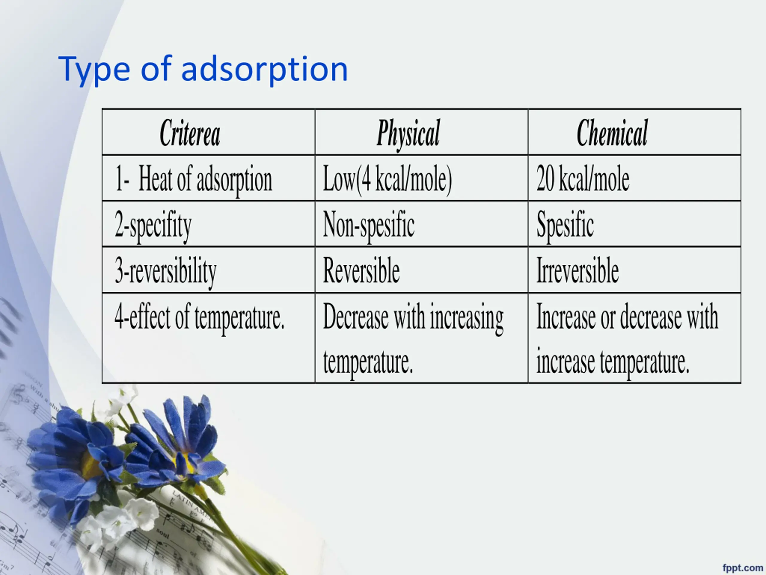 Type of adsorption 1- Heat of adsorption 2-specifity 3-reversibility 4-effect of temperature. Criterea Physical Low(4 kcal/mole) Non-spesific Reversible Decrease with increasing temperature. 20 kcal/mole Spesific Irreversible Increase or decrease with increase temperature. Chemical