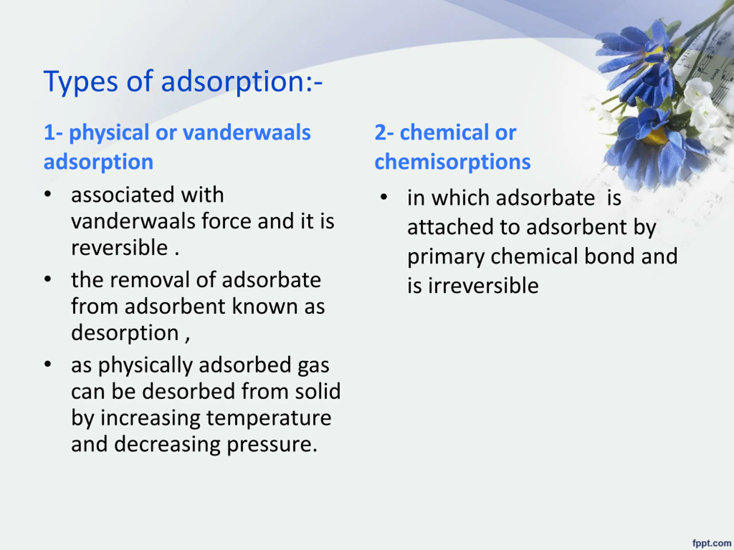 Types of adsorption:- 1- physical or vanderwaals adsorption associated with vanderwaals force and it is reversible . the removal of adsorbate from adsorbent known as desorption , as physically adsorbed gas can be desorbed from solid by increasing temperature and decreasing pressure. 2- chemical or chemisorptions in which adsorbate is attached to adsorbent by primary chemical bond and is irreversible