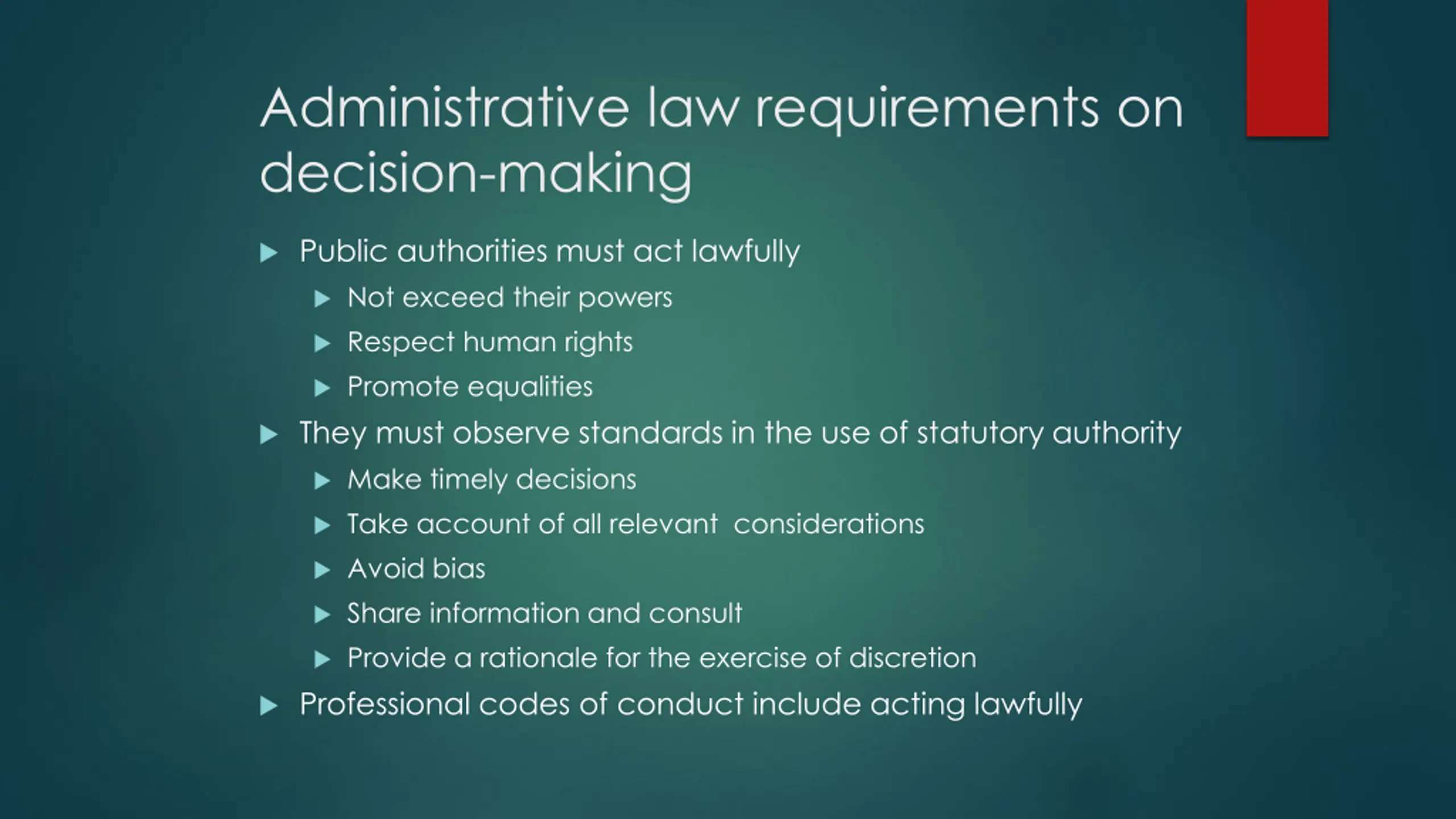 Administrative law requirements on decision-making Public authorities must act lawfully Not exceed their powers Respect human rights Promote equalities They must observe standards in the use of statutory authority Make timely decisions Take account of all relevant considerations Avoid bias Share information and consult Provide a rationale for the exercise of discretion Professional codes of conduct include acting lawfully