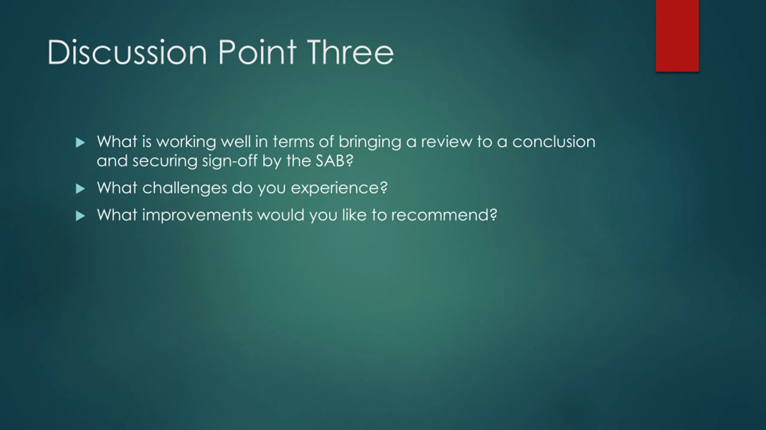 Discussion Point Three What is working well in terms of bringing a review to a conclusion and securing sign-off by the SAB? What challenges do you experience? What improvements would you like to recommend?