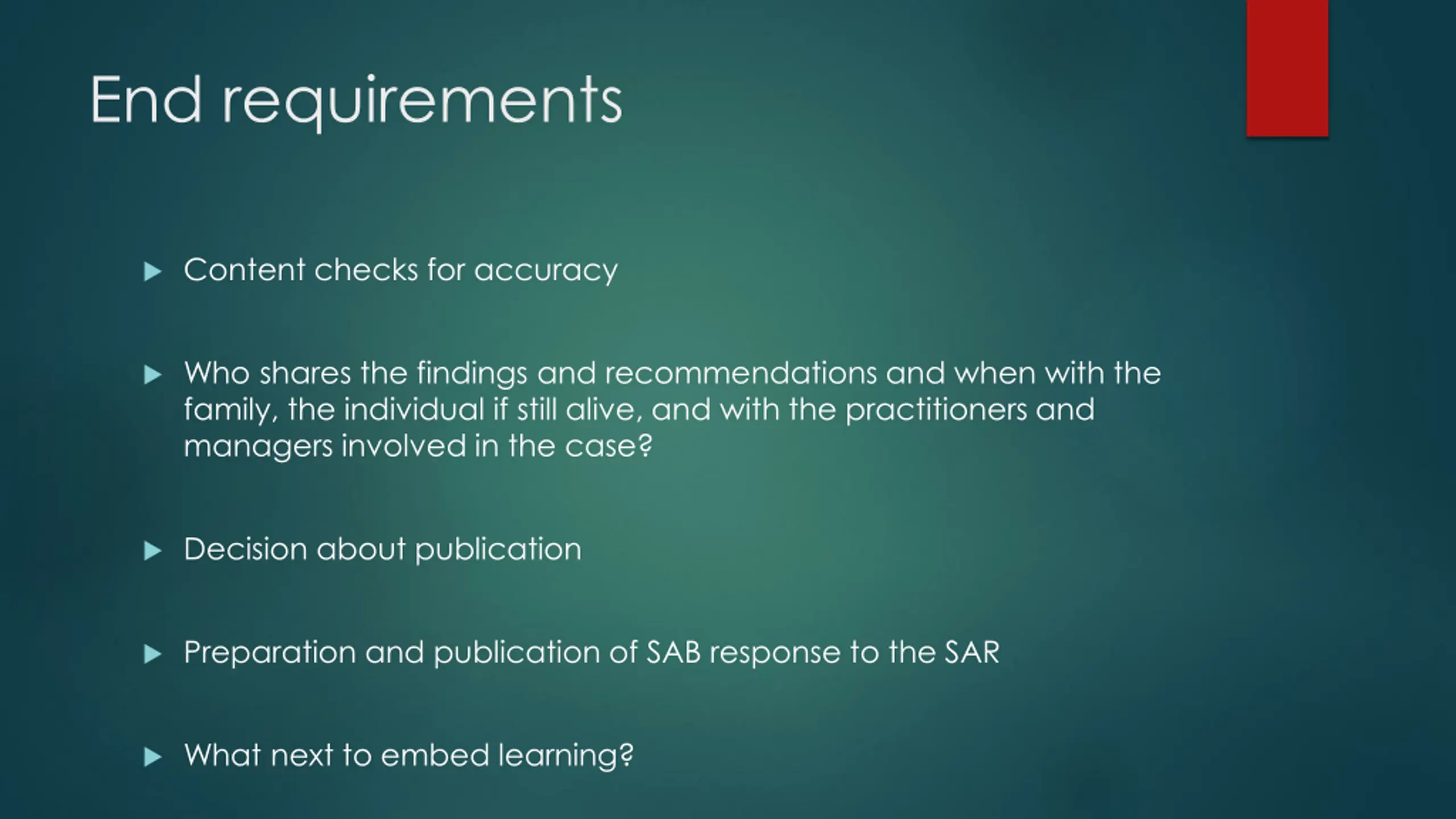 End requirements Content checks for accuracy Who shares the findings and recommendations and when with the family, the individual if still alive, and with the practitioners and managers involved in the case? Decision about publication Preparation and publication of SAB response to the SAR What next to embed learning?