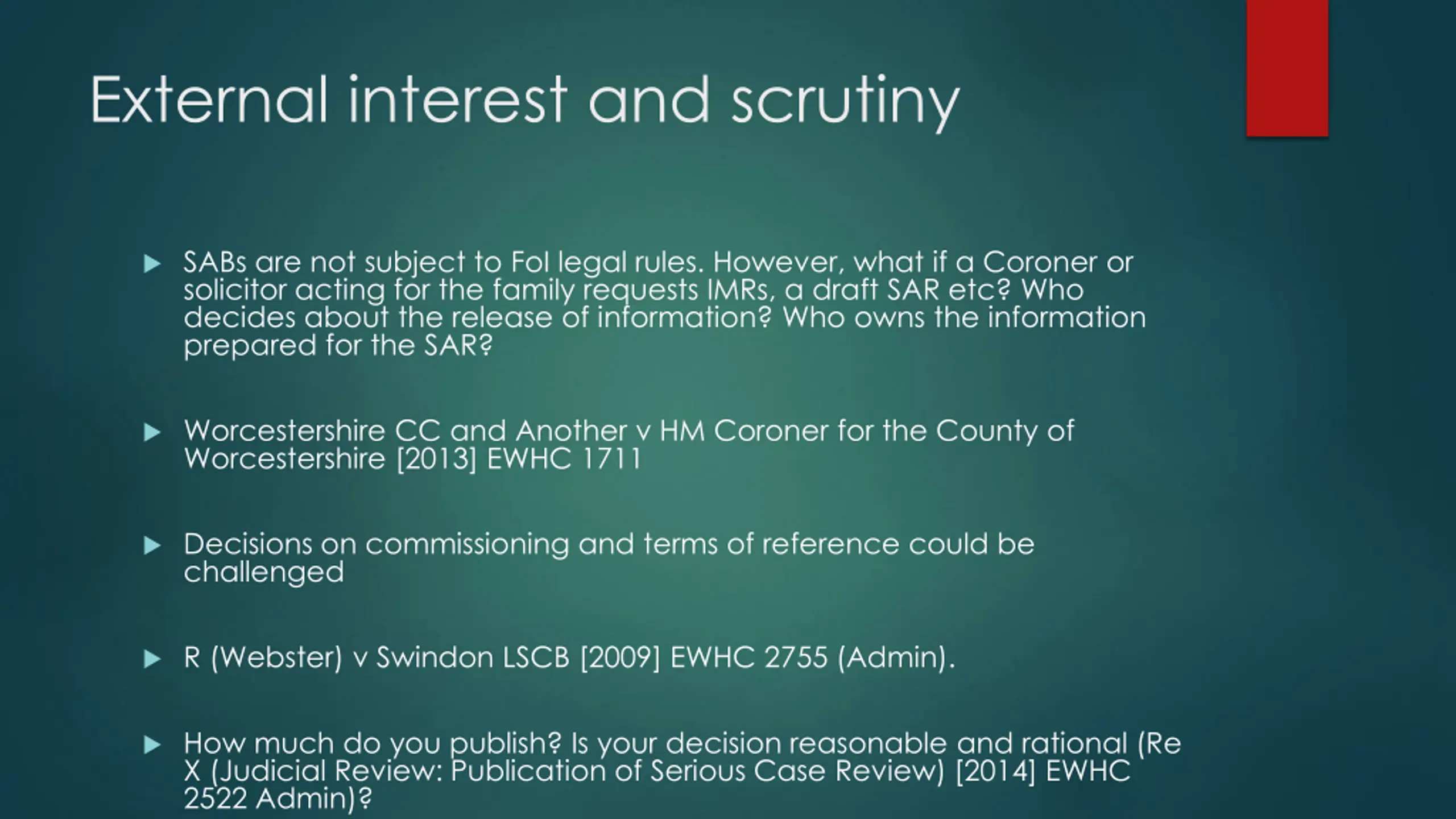 External interest and scrutiny SABs are not subject to FoI legal rules. However, what if a Coroner or solicitor acting for the family requests IMRs, a draft SAR etc? Who decides about the release of information? Who owns the information prepared for the SAR? Worcestershire CC and Another v HM Coroner for the County of Worcestershire [2013] EWHC 1711 Decisions on commissioning and terms of reference could be challenged R (Webster) v Swindon LSCB [2009] EWHC 2755 (Admin). How much do you publish? Is your decision reasonable and rational (Re X (Judicial Review: Publication of Serious Case Review) [2014] EWHC 2522 Admin)?