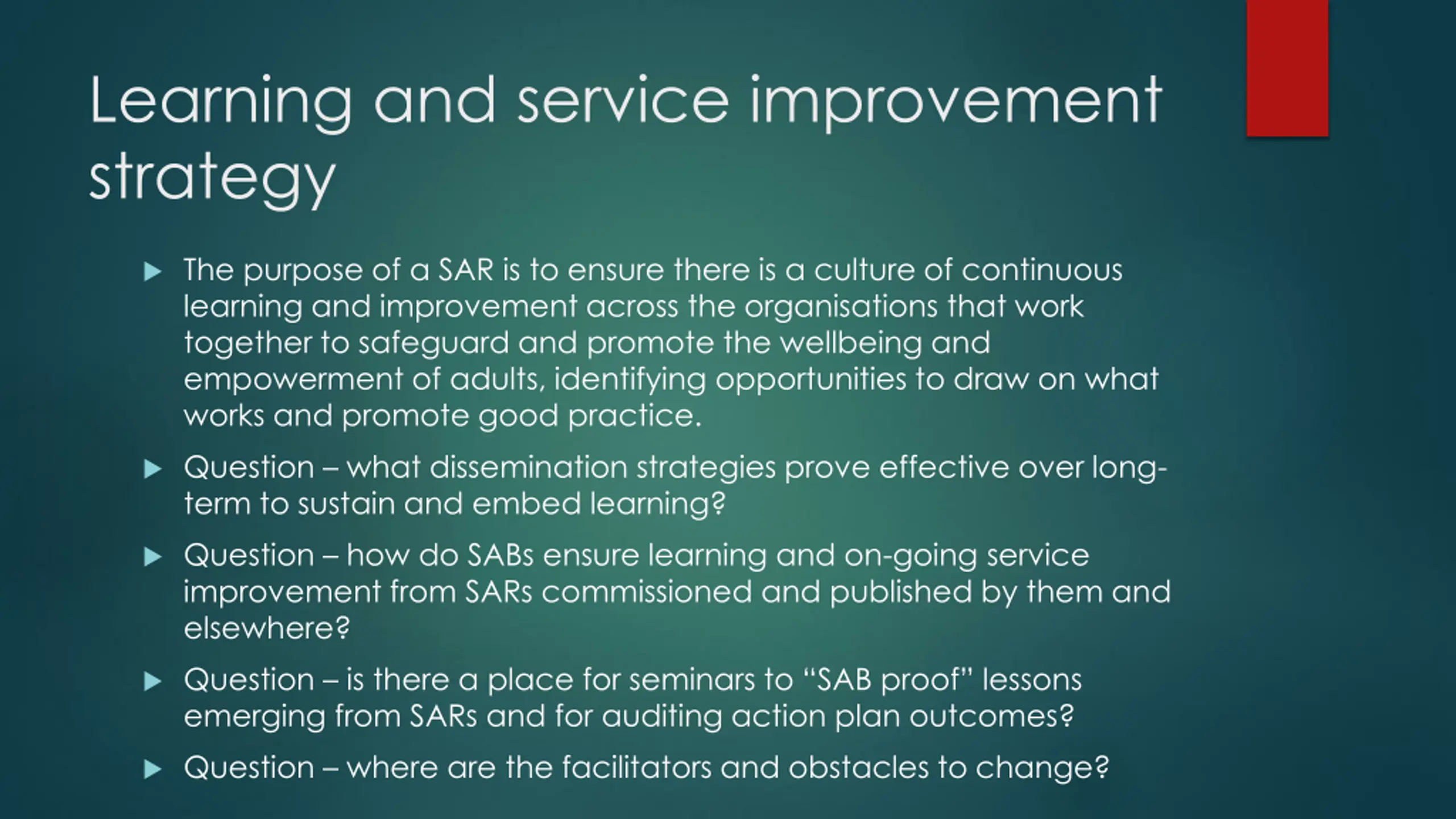 Learning and service improvement strategy The purpose of a SARis to ensure there is a culture of continuous learning and improvement across the organisations that work together to safeguard and promote the wellbeing and empowerment of adults, identifying opportunities to draw on what works and promote good practice. Question what dissemination strategies prove effective over long- term to sustain and embed learning? Question how do SABs ensure learning and on-going service improvement from SARs commissioned and published by them and elsewhere? Question is there a place for seminars to SAB proof lessons emerging from SARs and for auditing action plan outcomes? Question where are the facilitators and obstacles to change?
