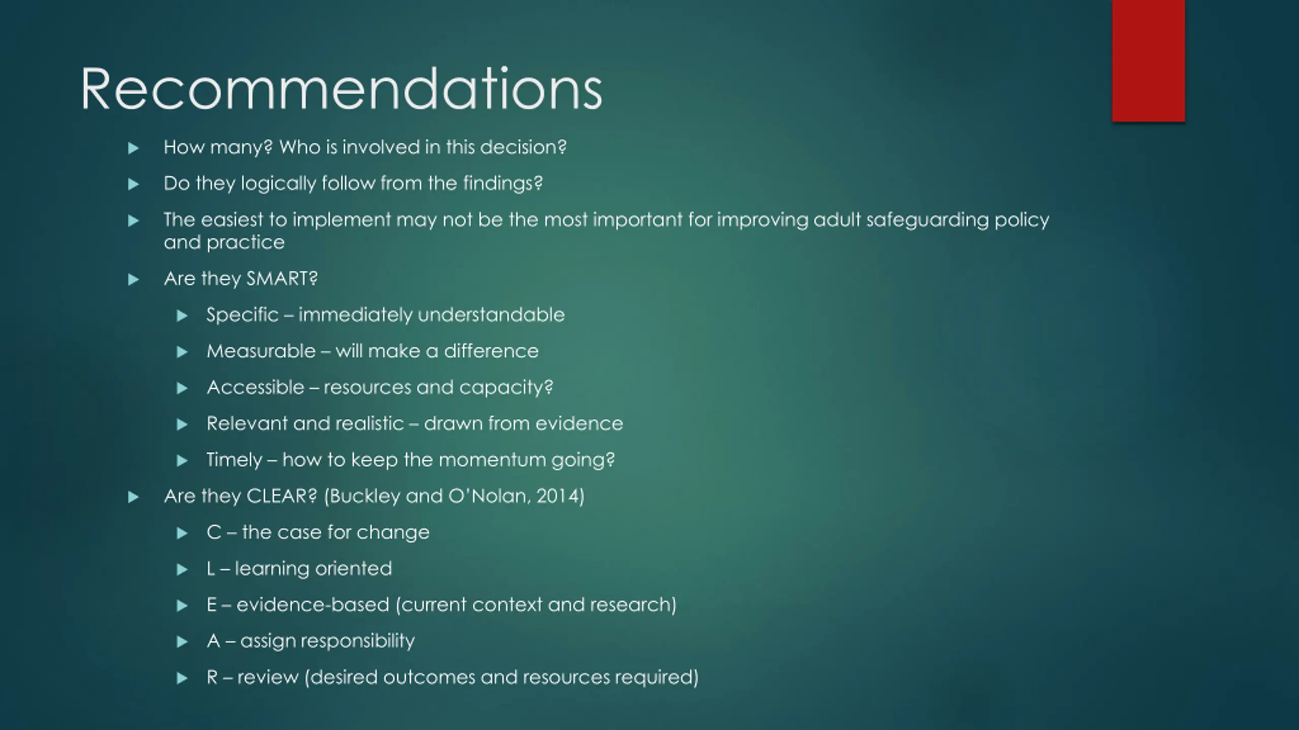 Recommendations How many? Who is involved in this decision? Do they logically follow from the findings? The easiest to implement may not be the most important for improving adult safeguarding policy and practice Are they SMART? Specific immediately understandable Measurable will make a difference Accessible resources and capacity? Relevant and realistic drawn from evidence Timely how to keep the momentum going? Are they CLEAR? (Buckley and O Nolan, 2014) C the case for change L learning oriented E evidence-based (current context and research) A assign responsibility R review (desired outcomes and resources required)