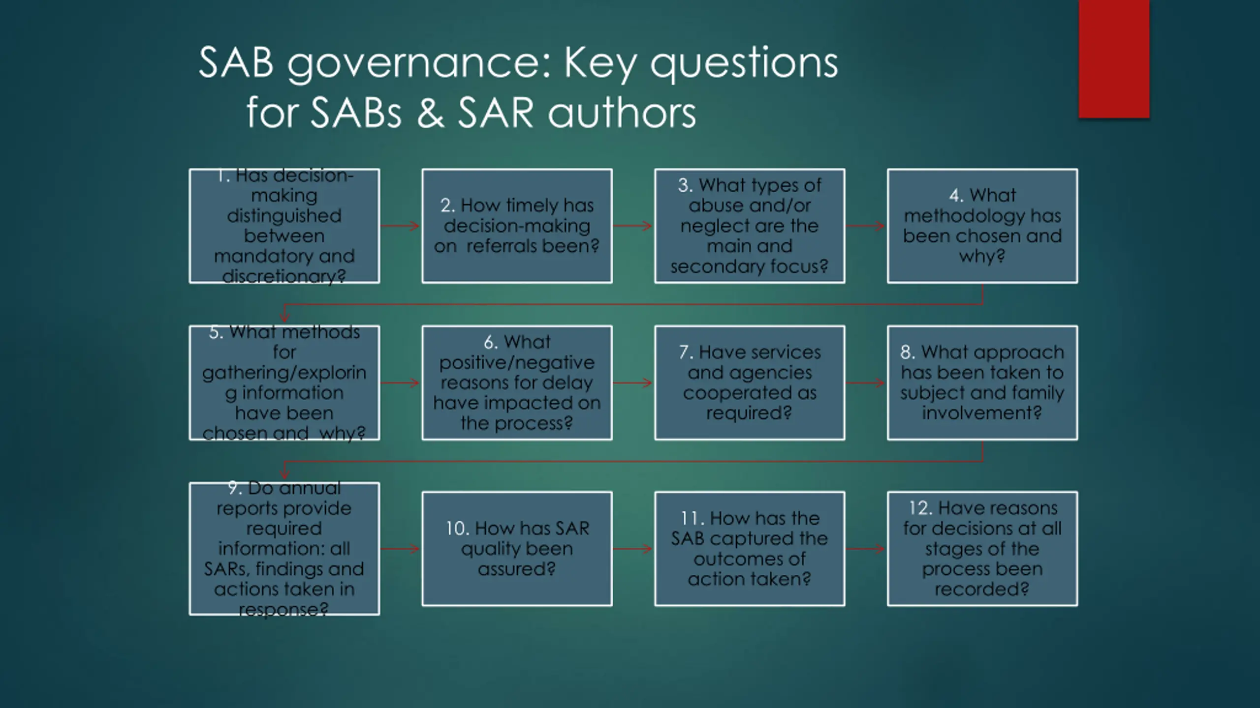 SAB governance: Key questions for SABs & SAR authors 1. Has decision- making distinguished between mandatory and discretionary? 3. What types of abuse and/or neglect are the main and secondary focus? 4. What 2. How timely has decision-making on referrals been? methodology has been chosen and why? 5. What methods for gathering/explorin g information have been chosen and why? 6. What 7. Have services and agencies cooperated as required? 8. What approach has been taken to subject and family involvement? positive/negative reasons for delay have impacted on the process? 9. Do annual reports provide required information: all SARs, findings and actions taken in response? 12. Have reasons for decisions at all stages of the process been recorded? 11. How has the SAB captured the outcomes of action taken? 10. How has SAR quality been assured?