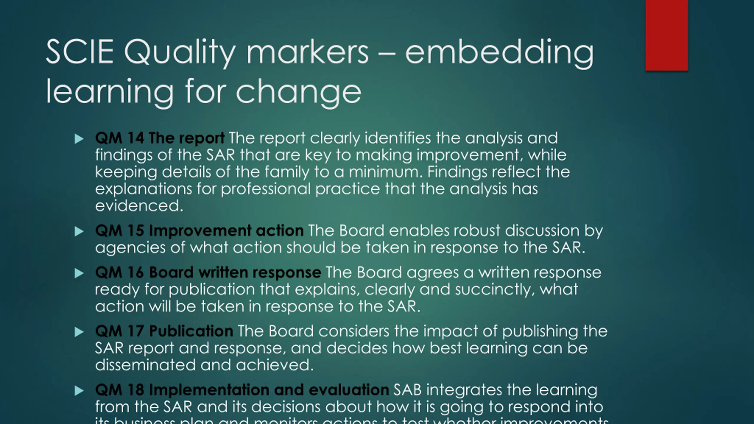 SCIE Quality markers embedding learning for change QM 14 The report The report clearly identifies the analysis and findings of the SAR that are key to making improvement, while keeping details of the family to a minimum. Findings reflect the explanations for professional practice that the analysis has evidenced. QM 15 Improvement action The Board enables robust discussion by agencies of what action should be taken in response to the SAR. QM 16 Board written response The Board agrees a written response ready for publication that explains, clearly and succinctly, what action will be taken in response to the SAR. QM 17 Publication The Board considers the impact of publishing the SAR report and response, and decides how best learning can be disseminated and achieved. QM 18 Implementation and evaluation SAB integrates the learning from the SAR and its decisions about how it is going to respond into its business plan and monitors actions to test whether improvements