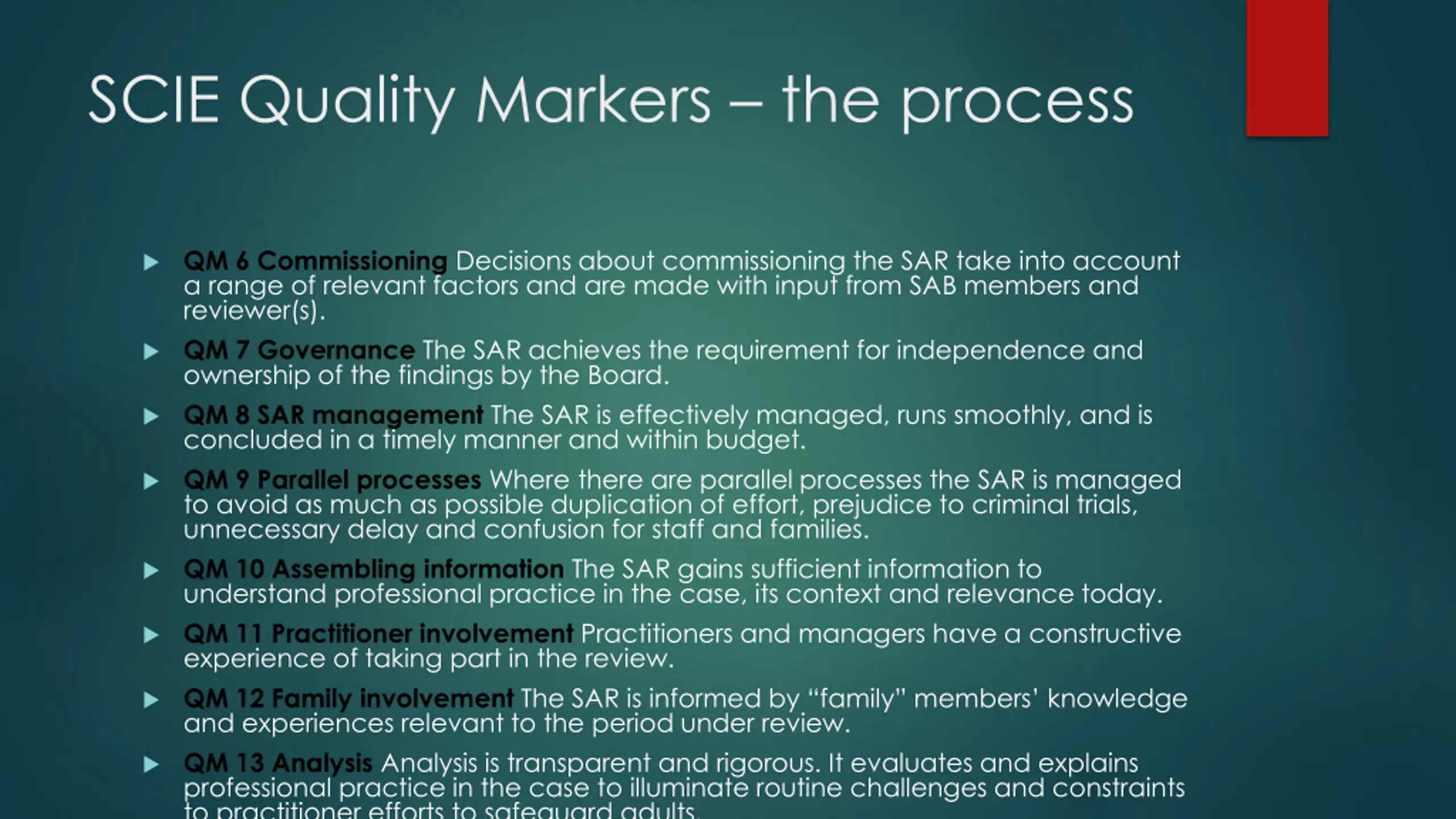 SCIE Quality Markers the process QM 6 Commissioning Decisions about commissioning the SAR take into account a range of relevant factors and are made with input from SAB members and reviewer(s). QM 7 Governance The SAR achieves the requirement for independence and ownership of the findings by the Board. QM 8 SAR management The SAR is effectively managed, runs smoothly, and is concluded in a timely manner and within budget. QM 9 Parallel processes Where there are parallel processes the SAR is managed to avoid as much as possible duplication of effort, prejudice to criminal trials, unnecessary delay and confusion for staff and families. QM 10 Assembling information The SAR gains sufficient information to understand professional practice in the case, its context and relevance today. QM 11 Practitioner involvement Practitioners and managers have a constructive experience of taking part in the review. QM 12 Family involvementThe SAR is informed by family members knowledge and experiences relevant to the period under review. QM 13 Analysis Analysis is transparent and rigorous. It evaluates and explains professional practice in the case to illuminate routine challenges and constraints to practitioner efforts to safeguard adults.