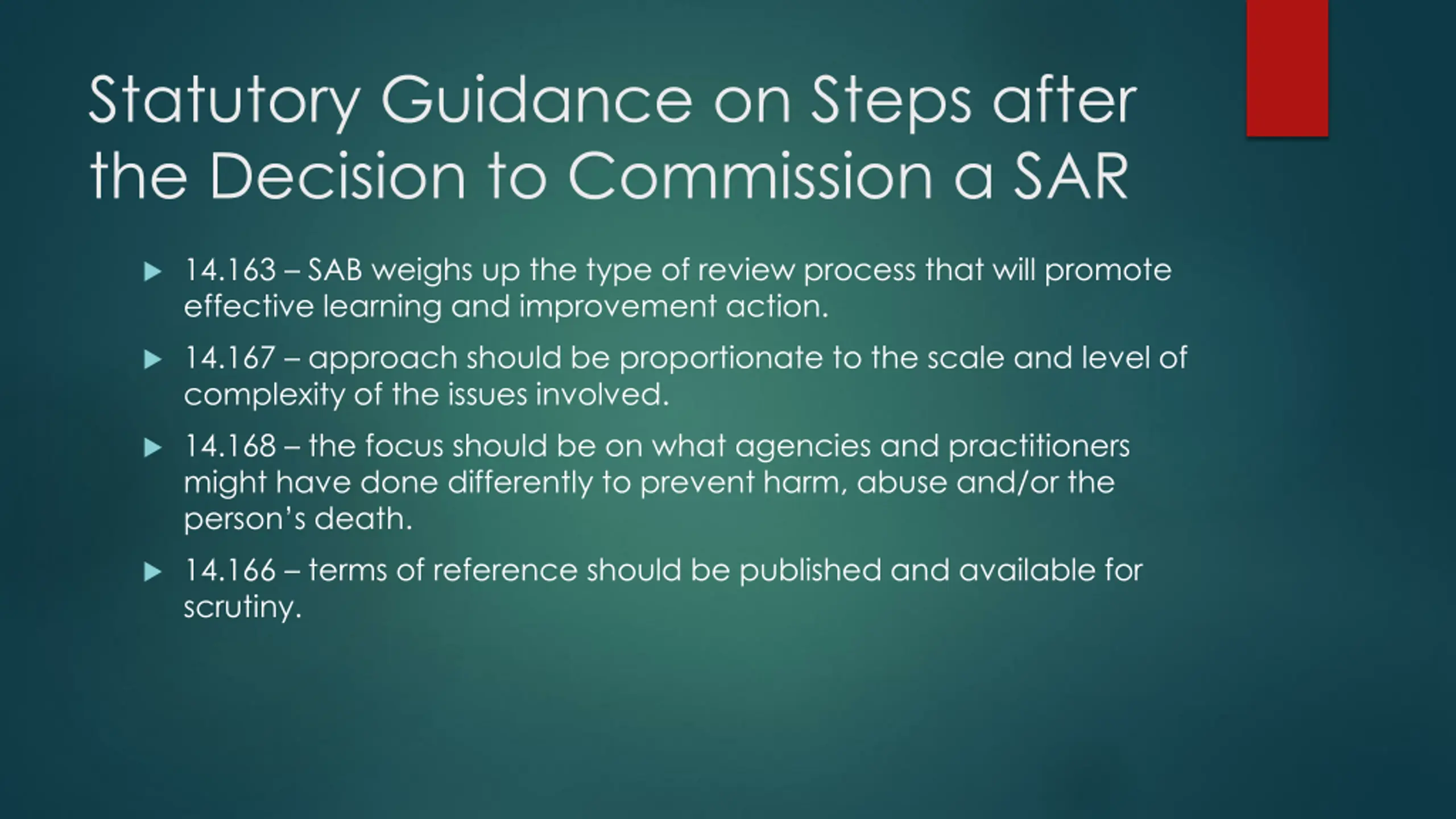 Statutory Guidance on Steps after the Decision to Commission a SAR 14.163 SAB weighs up the type of review process that will promote effective learning and improvement action. 14.167 approach should be proportionate to the scale and level of complexity of the issues involved. 14.168 the focus should be on what agencies and practitioners might have done differently to prevent harm, abuse and/or the person s death. 14.166 terms of reference should be published and available for scrutiny.