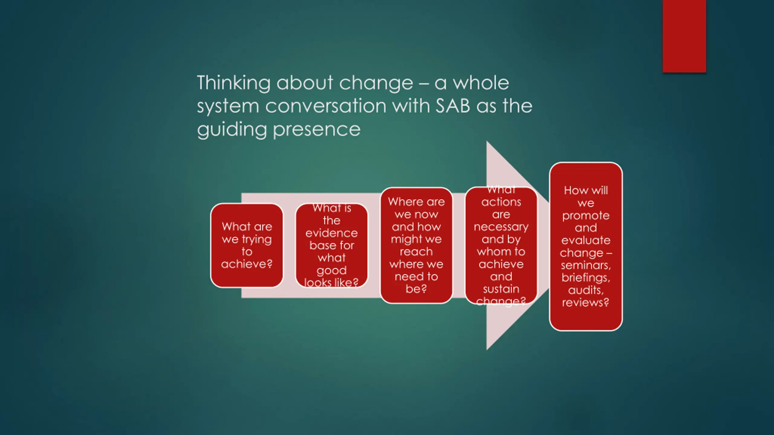 Thinking about change a whole system conversation with SAB as the guiding presence What actions are necessary and by whom to achieve and sustain change? How will we promote and evaluate change seminars, briefings, audits, reviews? Where are we now and how might we reach where we need to be? What is the evidence base for what good looks like? What are we trying to achieve?