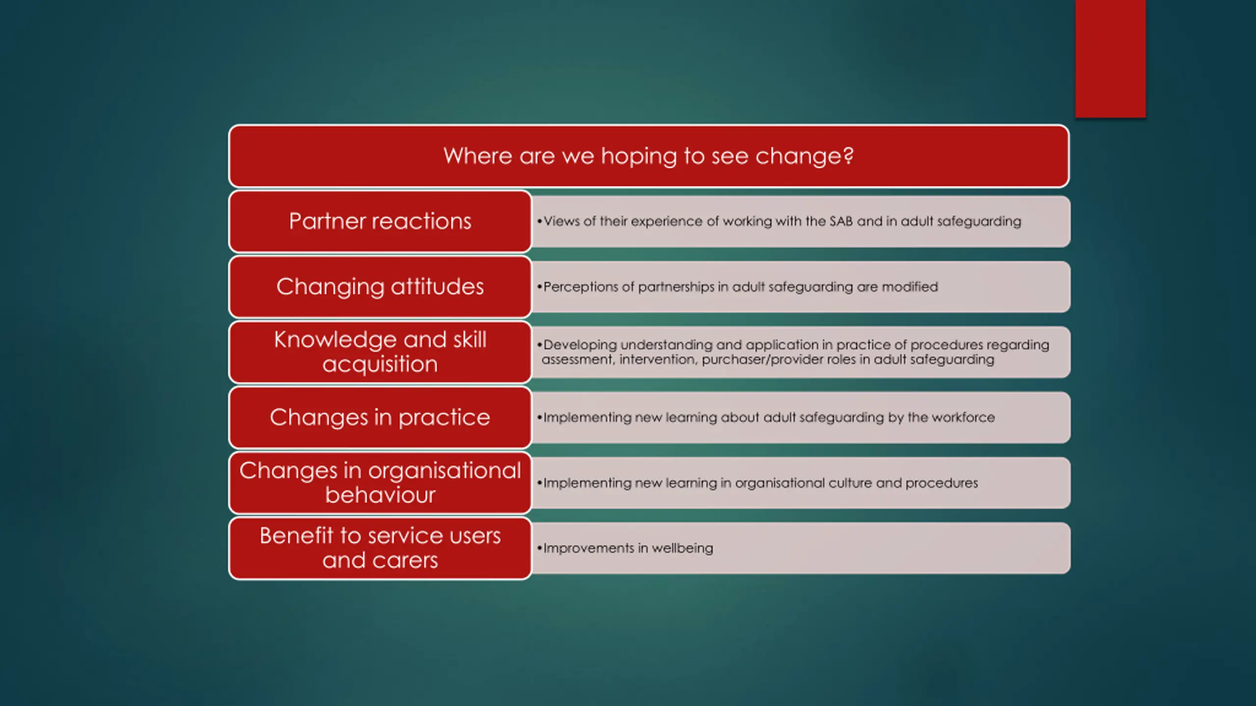 Where are we hoping to see change? Partner reactions Views of their experience of working with the SAB and in adult safeguarding Changing attitudes Perceptions of partnerships in adult safeguarding are modified Knowledge and skill acquisition Developing understanding and application in practice of procedures regarding assessment, intervention, purchaser/provider roles in adult safeguarding Changes in practice Implementing new learning about adult safeguarding by the workforce Changes in organisational behaviour Implementing new learning in organisational culture and procedures Benefit to service users and carers Improvements in wellbeing