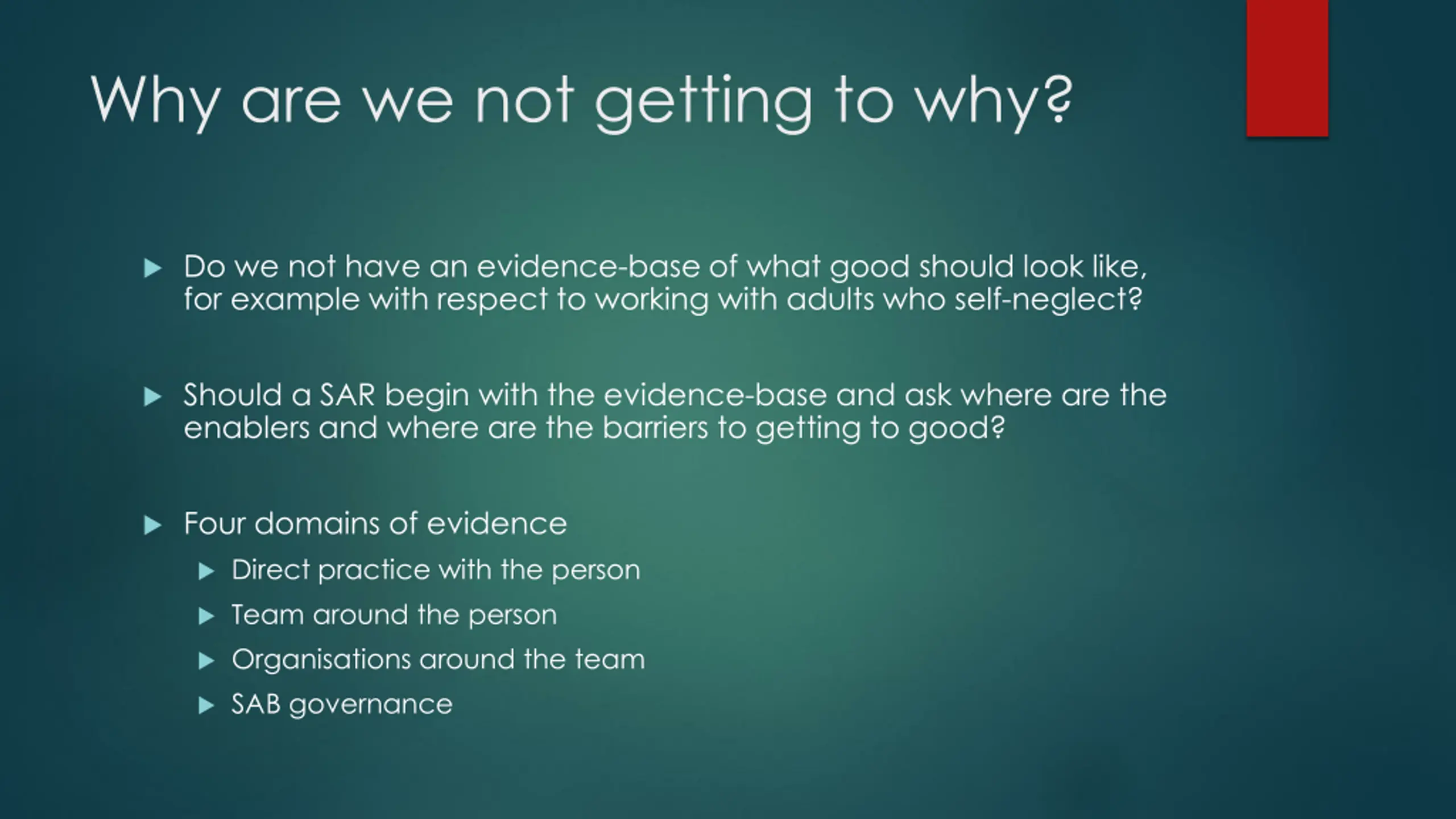 Why are we not getting to why? Do we not have an evidence-base of what good should look like, for example with respect to working with adults who self-neglect? Should a SAR begin with the evidence-base and ask where are the enablers and where are the barriers to getting to good? Four domains of evidence Direct practice with the person Team around the person Organisations around the team SAB governance